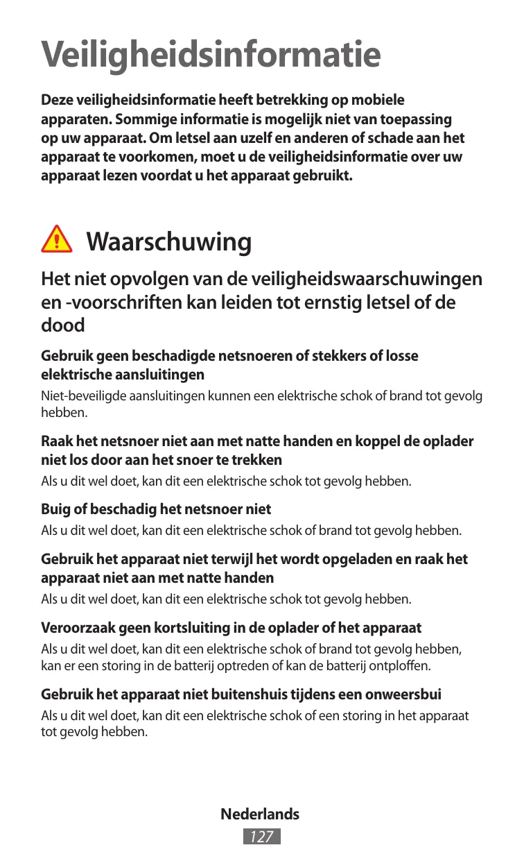 Manipulez l’appareil et le chargeur avec précaution, même lorsque vous devez vous en séparer • Ne jetez jamais la batterie ou l’appareil au feu. Ne posez jamais la batterie ou l’appareil à l’intérieur ou au-dessus d’appareils chauffants, tels que des fours à micro-ondes, des cuisinières ou des radiateurs. En cas de surchauffe, ils risquent d’exploser. Respectez la réglementation en vigueur dans votre pays concernant la mise au rebut des batteries ou des appareils usagé(e)s. • N’écrasez ou ne perforez jamais l’appareil. • Évitez d’exposer l’appareil à une pression externe élevée qui risquerait d’entraîner un court-circuit interne et une surchauffe.