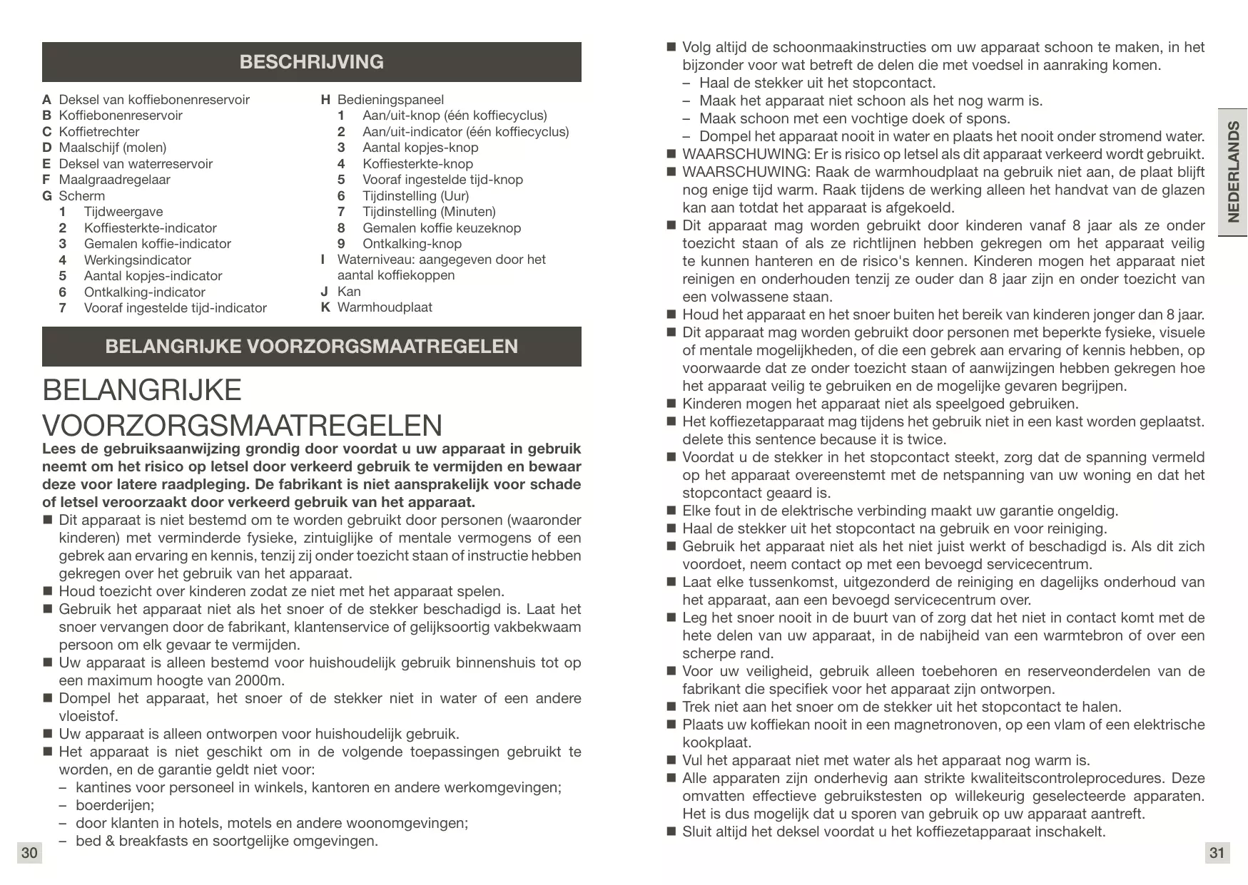 Vooraf ingestelde tijd-indicator (G7) verschijnt op het scherm. De tijdweergave (G1) geeft de vooraf ingestelde timer al knipperend weer om aan te geven dat de timer ingesteld kan worden. Deze status wordt afgesloten wanneer er binnen 5 seconden geen enkele knop wordt ingedrukt. 8. Stel de tijd in met behulp van de Tijd instelling (Uur) knop (H6) om het uur te selecteren. De uurwaarde wordt op het scherm weergegeven (houd de Tijdinstelling (Uur) knop (H6) ingedrukt om de waarde sneller te doorlopen). De tijdinstelstatus wordt nu afgesloten (de ingestelde tijd is opgeslagen). Als er binnen de 3 seconden niet op de knop wordt gedrukt, verdwijnt de Vooraf ingestelde tijd-indicator (G7) en geeft de Tijdweergave (G1) de huidige tijd weer. 9. In de Vooraf ingestelde tijd instelstatus (de Vooraf ingestelde tijd-indicator (G7) knippert), druk kort op de Vooraf ingestelde tijd-knop (H5) om de Vooraf ingestelde tijd instelstatus af te sluiten (de ingestelde tijd is opgeslagen na het aanpassen met de Uur (H6) en Minuut (H7) knoppen), de Vooraf ingestelde tijd-indicator (G7) verdwijnt en de Tijdweergave (G1) geeft de huidige tijd weer. 10. In stand-by, druk kort op de Vooraf ingestelde tijd-knop (H5), de Vooraf ingestelde tijdindicator (G7) knippert, de Tijdweergave (G1) knippert om de vooraf ingestelde tijd 3 seconden weer te geven, de Tijdweergave (G1) geeft de huidige tijd weer en de Vooraf ingestelde tijd-indicator (G7) verschijnt om aan te geven dat het aftellen van de Vooraf ingestelde tijd is gestart. 11. Zodra de Vooraf ingestelde tijd is bereikt, start de koffiezetcyclus automatisch. – De Vooraf ingestelde tijd-indicator (G7) verdwijnt. – Het Aan/uit-controlelampje (H2) knippert. – De Werkingsindicator (G4) knippert. – Het heet water stroomt door de gemalen koffie in de filter. 12. Aan het einde van de koffiezetcyclus: – Het Aan/uit-controlelampje (H2) stopt met knipperen en brandt nu continu. – De Werkingsindicator (G4) stopt met knipperen en verdwijnt. – De Vooraf ingestelde tijd-indicator (G7) verdwijnt. – De koffie wordt nu maximaal 30 minuten warm gehouden. – Het Aan/uit-controlelampje (H2) dooft aan het einde van de warmhoudcyclus. 1. F Rueda de ajuste de la molienda G Pantalla 1 Visualización de la hora 2 Indicador de intensidad del café 3 Indicador de café molido 4 Indicador de funcionamiento 5 Indicador del número de tazas 6 Indicador de descalcificación 7 Indicador de la hora preajustada