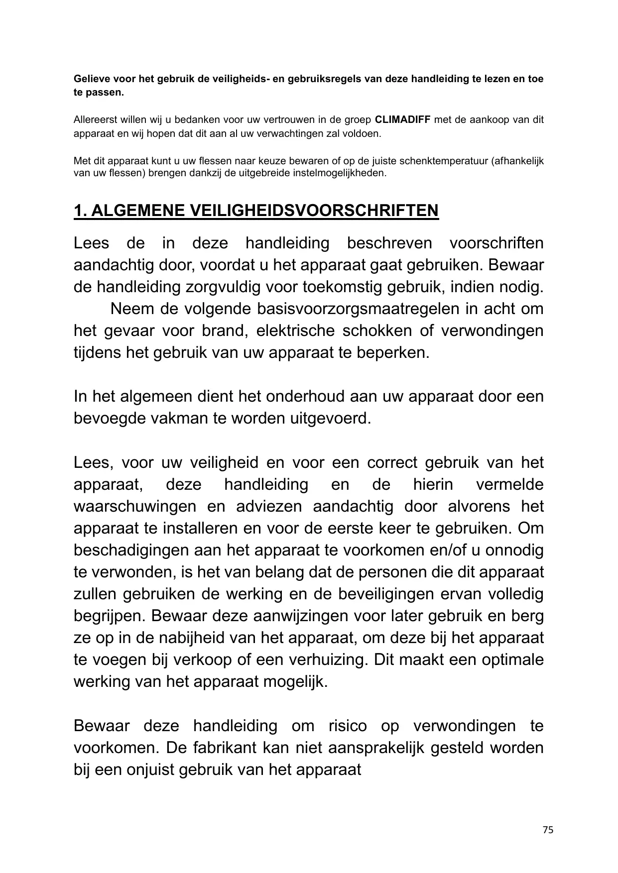 Avant d’utiliser votre appareil pour la première fois, veuillez lire attentivement ce manuel d’utilisation. Conservez-le précieusement de façon à pouvoir vous y référer au besoin. Afin de réduire le risque d’incendie, de choc électrique ou de blessure lors de l’utilisation de votre cave, merci de suivre les précautions données. D'une manière générale, votre appareil doit être entretenu par un professionnel qualifié. Pour votre sécurité et pour une utilisation correcte de l’appareil, avant d’installer et d’utiliser l’appareil pour la première fois, lisez attentivement cette notice, y compris les mises en garde et les conseils utiles qu’elle contient. Afin d’éviter d’endommager l’appareil et/ou de vous blesser inutilement, il est important que les personnes amenées à utiliser cet appareil aient pris entièrement connaissance de son fonctionnement ainsi que de ses instructions de sécurité. Conservez ces consignes pour plus tard et pensez à les ranger à côté de l’appareil, afin qu’elles soient transmises avec ce dernier en cas de vente ou de déménagement. Cela permettra de garantir un fonctionnement optimal de l’appareil. Pour éviter tout risque de blessure, conservez cette notice. Le fabricant ne saurait en effet être tenu responsable en cas de mauvaise manipulation de l’appareil. Cet appareil est destiné exclusivement à un usage domestique et est prévu pour le stockage de boissons spéciales à une 3
