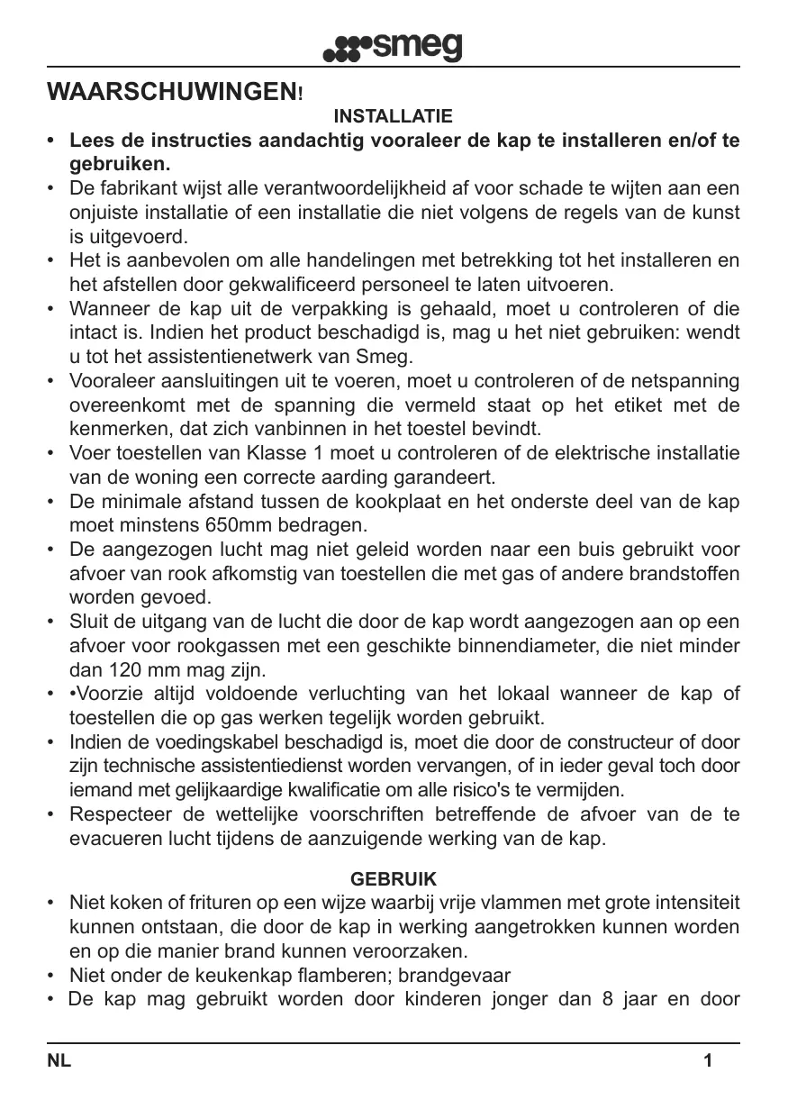 • Lees de instructies aandachtig vooraleer de kap te installeren en/of te gebruiken. • De fabrikant wijst alle verantwoordelijkheid af voor schade te wijten aan een onjuiste installatie of een installatie die niet volgens de regels van de kunst is uitgevoerd. • Het is aanbevolen om alle handelingen met betrekking tot het installeren en het afstellen door gekwalificeerd personeel te laten uitvoeren. • Wanneer de kap uit de verpakking is gehaald, moet u controleren of die intact is. Indien het product beschadigd is, mag u het niet gebruiken: wendt u tot het assistentienetwerk van Smeg. • Vooraleer aansluitingen uit te voeren, moet u controleren of de netspanning overeenkomt met de spanning die vermeld staat op het etiket met de kenmerken, dat zich vanbinnen in het toestel bevindt. • Voer toestellen van Klasse 1 moet u controleren of de elektrische installatie van de woning een correcte aarding garandeert. • De minimale afstand tussen de kookplaat en het onderste deel van de kap moet minstens 650mm bedragen. • De aangezogen lucht mag niet geleid worden naar een buis gebruikt voor afvoer van rook afkomstig van toestellen die met gas of andere brandstoffen worden gevoed. • Sluit de uitgang van de lucht die door de kap wordt aangezogen aan op een afvoer voor rookgassen met een geschikte binnendiameter, die niet minder dan 120 mm mag zijn. • •Voorzie altijd voldoende verluchting van het lokaal wanneer de kap of toestellen die op gas werken tegelijk worden gebruikt. • Indien de voedingskabel beschadigd is, moet die door de constructeur of door zijn technische assistentiedienst worden vervangen, of in ieder geval toch door iemand met gelijkaardige kwalificatie om alle risico's te vermijden. • Respecteer de wettelijke voorschriften betreffende de afvoer van de te evacueren lucht tijdens de aanzuigende werking van de kap. GEBRUIK