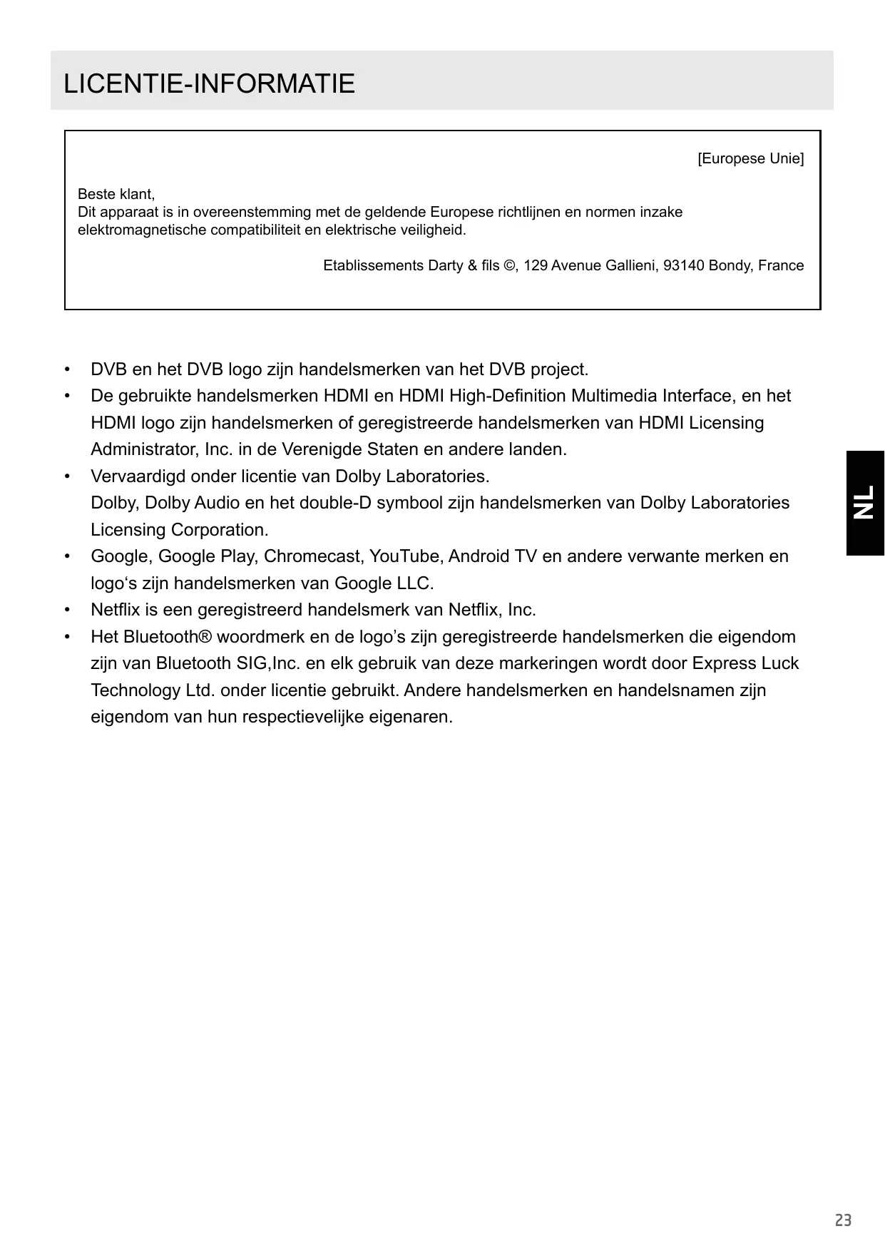 Administrator, Inc. aux États-Unis et dans d’autres pays. Fabriqué sous licence de Dolby Laboratories. « Dolby », « Dolby Audio » et le symbole du double D sont des marques commerciales de Dolby Laboratories Licensing Corporation. Google, Google Play, Chromecast, YouTube, TV Android et les autres marques et logos associés sont des marques commerciales de Google LLC. Netflix est une marque déposée de Netflix, Inc. Les logos et la marque verbale Bluetooth® sont des marques déposées détenues par Bluetooth SIG, Inc. et tout usage de ces marques par Express Luck Technology Ltd. se fait sous licence. Les autres marques et noms commerciaux appartiennent à leurs propriétaires respectifs.