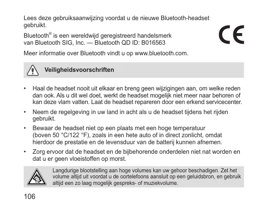 Lees deze gebruiksaanwijzing voordat u de nieuwe Bluetooth-headset gebruikt. Bluetooth® is een wereldwijd geregistreerd handelsmerk van Bluetooth SIG, Inc. — Bluetooth QD ID: B016563 Meer informatie over Bluetooth vindt u op www.bluetooth.com. Veiligheidsvoorschriften •