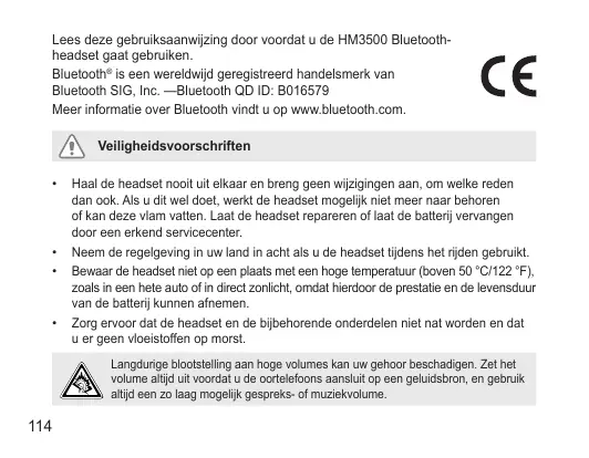 Lees deze gebruiksaanwijzing door voordat u de HM3500 Bluetoothheadset gaat gebruiken. Bluetooth® is een wereldwijd geregistreerd handelsmerk van Bluetooth SIG, Inc. —Bluetooth QD ID: B016579 Meer informatie over Bluetooth vindt u op www.bluetooth.com. Veiligheidsvoorschriften