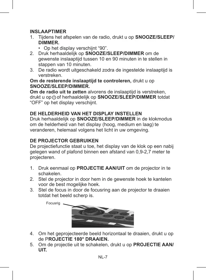 SNOOZE/SLEEP/DIMMER. Pour éteindre la radio avant la du délai de la fonction dormir, appuyez sur ou appuyez plusieurs fois sur SNOOZE/SLEEP/ DIMMER jusqu’à ce que « OFF » à l’écran. RÉGLER LA LUMINOSITÉ DE L’ÉCRAN Dans le mode de l’heure, appuyez plusieurs fois sur SNOOZE/SLEEP/DIMMER pour la luminosité de l’écran (Haut, Moyen ou Bas) en fonction de la luminosité ambiante. UTILISER LE PROJECTEUR La fonction de projection vous permet l’heure sur un mur proche ou un plafond à une distance comprise entre 0,9 et 2,7 mètres. 1. Appuyez une fois sur PROJECTION ON/OFF pour allumer le projecteur. 2. Réglez le projecteur en l’inclinant dans l’angle désiré pour optimiser la projection. 3. Faites la mise au point en tournant la molette de mise au point du projecteur jusqu’à ce que l’image soit nette. Molette de mise au point