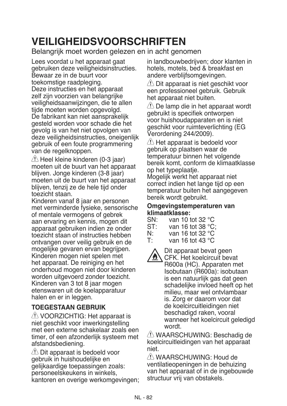 Cet appareil n’est pas conçu pour une utilisation professionnelle. N’utilisez pas l’appareil en extérieur. L’ampoule utilisée dans l’appareil est spécialement conçue pour des appareils ménagers et ne convient pas à l’éclairage général d’une pièce au domicile (Règlement CE 244/2009). L’appareil est conçu pour fonctionner dans des endroits où la température ambiante se trouve dans les plages suivantes, en fonction de la classe climatique indiquée sur la plaque signalétique. L’appareil peut ne pas fonctionner correctement s’il est exposé pendant une période prolongée à des températures non comprises dans la plage spécifiée. Températures ambiantes classe climatique : SN: De 10 à 32 °C ST: De 16 à 38 °C; N: De 16 à 32 °C T: De 16 à 43 °C Cet appareil ne contient pas de CFC. Le circuit de réfrigérant contient du R600a (HC). Appareils avec isobutane (R600a) : l’isobutane est un gaz naturel qui n’est pas nuisible à l’environnement, mais il est inflammable. Par conséquent, assurez-vous que les tuyaux du circuit réfrigérant ne sont pas endommagés, surtout lorsque vous videz le circuit réfrigérant. AVERTISSEMENT : N’endommagez pas les tuyaux du circuit de refroidissement de l’appareil. AVERTISSEMENT : Veillez à ce que les ouvertures de ventilation,