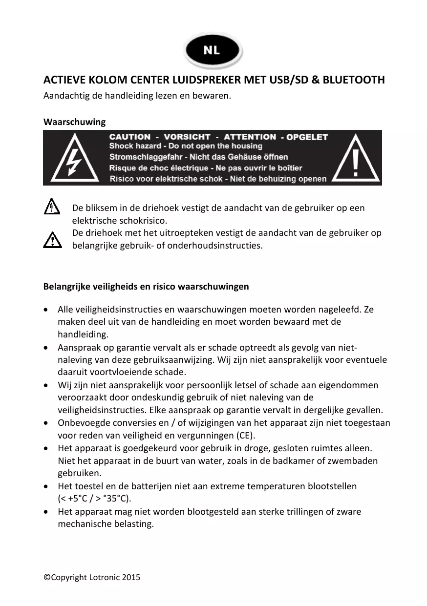 ACTIEVE KOLOM CENTER LUIDSPREKER MET USB/SD & BLUETOOTH Aandachtig de handleiding lezen en bewaren. Waarschuwing