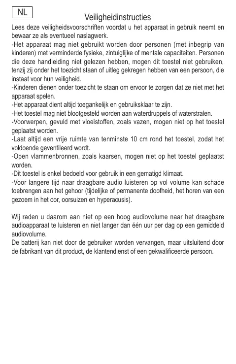 Lees deze veiligheidsvoorschriften voordat u het apparaat in gebruik neemt en bewaar ze als eventueel naslagwerk. -Het apparaat mag niet gebruikt worden door personen (met inbegrip van kinderen) met verminderde fysieke, zintuiglijke of mentale capaciteiten. Personen die deze handleiding niet gelezen hebben, mogen dit toestel niet gebruiken, tenzij zij onder het toezicht staan of uitleg gekregen hebben van een persoon, die instaat voor hun veiligheid. -Kinderen dienen onder toezicht te staan om ervoor te zorgen dat ze niet met het apparaat spelen. -Het apparaat dient altijd toegankelijk en gebruiksklaar te zijn. -Het toestel mag niet blootgesteld worden aan waterdruppels of waterstralen. -Voorwerpen, gevuld met vloeistoffen, zoals vazen, mogen niet op het toestel geplaatst worden. -Laat altijd een vrije ruimte van tenminste 10 cm rond het toestel, zodat het voldoende geventileerd wordt. -Open vlammenbronnen, zoals kaarsen, mogen niet op het toestel geplaatst worden. -Dit toestel is enkel bedoeld voor gebruik in een gematigd klimaat. -Voor langere tijd naar draagbare audio luisteren op vol volume kan schade toebrengen aan het gehoor (tijdelijke of permanente doofheid, het horen van een gezoem in het oor, oorsuizen en hyperacusis). Wij raden u daarom aan niet op een hoog audiovolume naar het draagbare audioapparaat te luisteren en niet langer dan één uur per dag op een gemiddeld audiovolume. De batterij kan niet door de gebruiker worden vervangen, maar uitsluitend door de fabrikant van dit product, de klantendienst of een gekwalificeerde persoon.