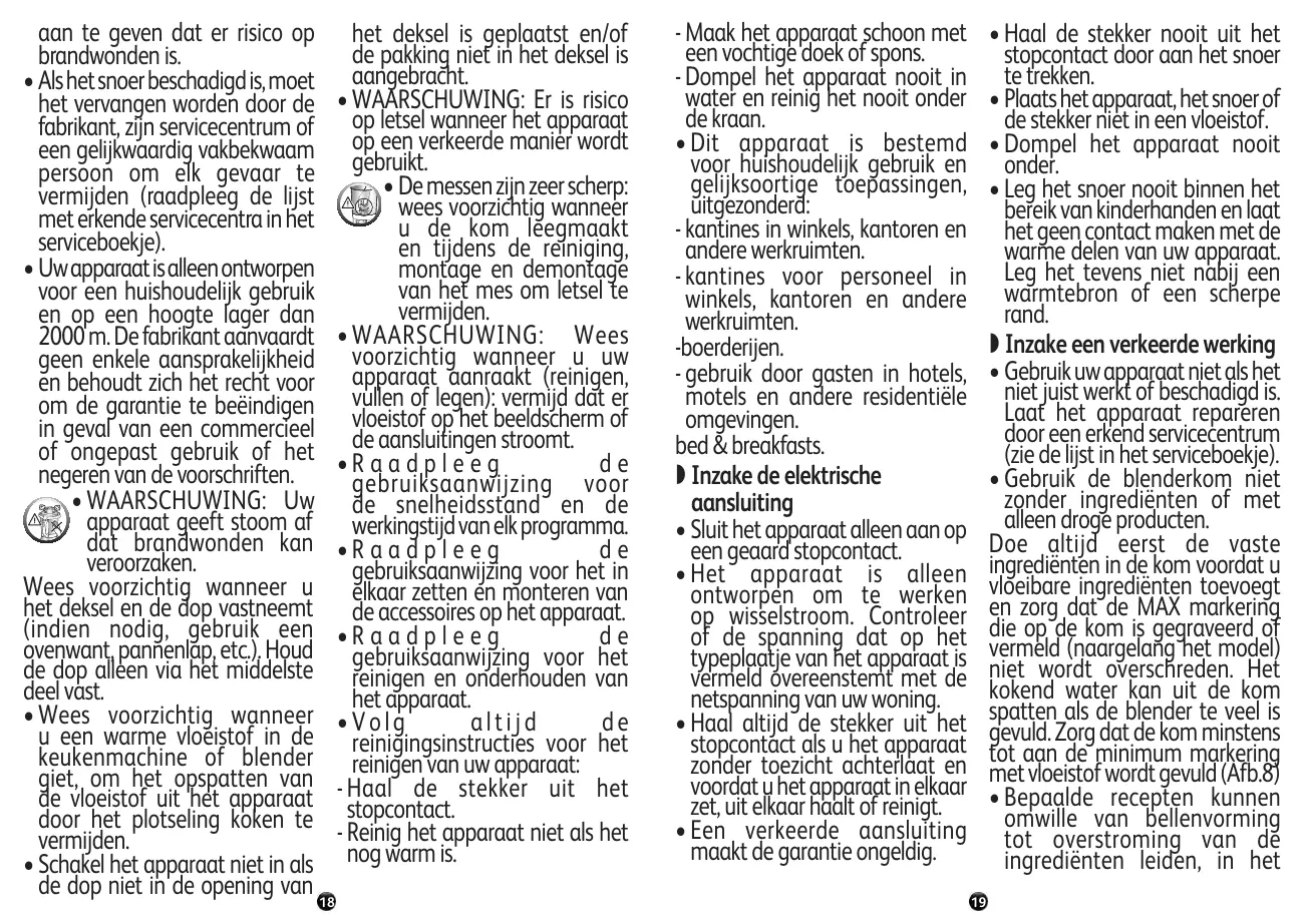 De hoeveelheid ingrediënten is te toegestane hoeveelheid in acht. groot of te klein. De hoeveelheid ingrediënten is te groot. Verminder de hoeveelheid ingrediënten Het deksel is niet correct geplaatst of Zet de afdichtingsring op het deksel. vergrendeld. afdichtingsringhouder en klik het geheel op het deksel. De afdichtingsring is niet geplaatst. Vervang de afdichtingsring. Neem contact op met een erkend De afdichtingsring is gebarsten of service center. versleten. Maak kleinere stukjes of verminder de De stukjes zijn te groot of te hard. hoeveelheden. Voeg vloeistof toe. Trek de stekker eruit en laat het De motor is overbelast door een te apparaat 30 minuten afkoelen en grote hoeveelheid ingrediënten of te verminder de hoeveelheid ingrediënten harde of te grote stukjes. die u wilt verwerken. Trek de stekker van het apparaat uit het stopcontact. Voeg een beetje De kom is leeg of bijna leeg of de vloeistof toe tot het minimum niveau bereiding is niet vloeibaar genoeg van de kom (zie afb. 7). Trek de stekker van het apparaat uit het De verwarmingsweerstand werkt niet. stopcontact en neem contact op met een geautoriseerd service-centrum. Trek de stekker van het apparaat uit het De temperatuursensor 1 werkt niet stopcontact en neem contact op met meer. een geautoriseerd service-centrum.