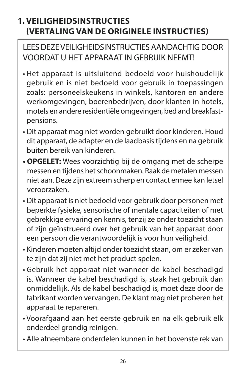 • L’appareil est destiné à un usage domestique seulement et n’est pas destiné à être utilisé dans des applications telles que : les cuisines du personnel dans les magasins, les bureaux et autres environnements de travail ; les fermes ; par les clients d’hôtels, de motels et d’autres environnements de type résidentiel ; les établissements de type chambres d’hôtes. • Cet appareil ne doit pas être utilisé par des enfants. • Garder l’appareil, l’adaptateur secteur et la base de chargement hors de portée des enfants pendant et après leur utilisation. • ATTENTION : Être prudent lorsque vous manipuler les lames tranchantes et procéder au nettoyage. Ne pas toucher les lames métalliques. Elles sont toutes extrêmement tranchantes et un contact peut entraîner des blessures. • Cet appareil n’est pas destiné à être utilisé par des personnes ayant des capacités physiques, sensorielles ou mentales réduites ou un manque d’expérience et de connaissances, à moins qu’elles soient sous surveillance ou aient été informées de la manière de l’utiliser par une personne responsable de leur sécurité. • Surveiller les enfants afin de vous assurer qu’ils ne jouent pas avec ce produit. • Ne pas utiliser l’appareil si le câble est endommagé. • Si le câble est endommagé, cesser immédiatement d’utiliser l’appareil. Si le câble est endommagé, le fabricant doit le remplacer. Aucune réparation ne doit être effectuée par le client. • Avant la première utilisation et après chaque utilisation, nettoyer soigneusement chaque pièce. 1