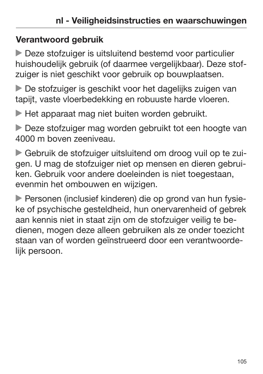 Cet aspirateur ne doit pas être utilisé en extérieur. Cet aspirateur est conçu pour une utilisation jusqu'à 4000 m d'altitude au-dessus du niveau de la mer. N'utilisez l'aspirateur que dans le cadre domestique, pour aspirer des poussières sèches. N'utilisez pas cet aspirateur sur les hommes et les animaux. Toute autre application, adaptation ou modification de l'aspirateur est interdite. Les personnes (y compris les enfants) qui ne sont pas en mesure d'utiliser l'aspirateur en toute sécurité en raison de déficiences physiques, sensorielles ou mentales, de leur inexpérience ou de leur ignorance ne doivent pas utiliser l'aspirateur sans la surveillance ou les instructions d'une personne responsable.