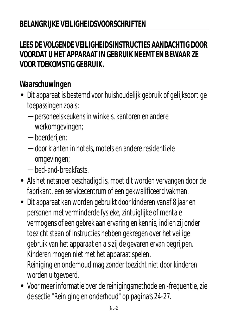 - Dit apparaat kan worden gebruikt door kinderen vanaf 8aar en personen met verminderde fysieke, zintuiglijke of mentale vermogens of een gebrek aan ervaring en kennis, indien zich onder toezicht staan of instructies hebben gekregen over het veilige gebruik van het apparaat en als zij de bevaren ervan begrijpen. Kinderen mighteniet met het apparaat spelen.
