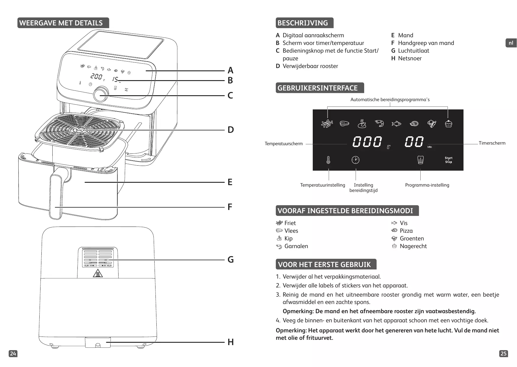 2. Retirez délicatement le tiroir de cuisson avec sa grille amovible de l’appareil. 3. Placez les aliments dans le tiroir de cuisson. • Remarque : ne dépassez jamais la quantité maximale indiquée dans le tableau (voir la section « Guide de cuisson »), car cela pourrait altérer la qualité du résultat final. 4. Replacez le tiroir de cuisson dans l’appareil. • Attention : ne touchez pas le tiroir de cuisson pendant l’utilisation et pendant un certain temps après utilisation, car il devient très chaud. Tenez le tiroir de cuisson par la poignée uniquement. 5. Appuyez sur pour allumer l’appareil. L’écran affiche le programme « Manuel » par défaut : 200°C / 15 minutes. Le bouton clignote. 6. Vous pouvez maintenant choisir entre le mode de cuisson prédéfini et le réglage manuel. a. Si vous choisissez le mode de cuisson prédéfini : • Appuyez sur le bouton Le mode Frites se met à clignoter. • Sélectionnez le mode de cuisson souhaité en tournant le bouton de contrôle (ces modes sont décrits en détail dans la section « Guide de cuisson »). • Si vous devez régler la température : appuyez sur le bouton puis utilisez le bouton de contrôle pour régler la température. Plage de contrôle : min. 80°C, max. 200°C. Une fois la sélection effectuée, la température clignote pendant 6 secondes avant d’être réglée. • S i vous devez régler le minuteur : appuyez sur le bouton puis utilisez le bouton de contrôle pour régler le temps. Plage de contrôle : min. 1 minute, max. 60 minutes. Une fois votre sélection effectuée, le minuteur clignote pendant 6 secondes avant d’être réglé. • Si vous devez régler la température : appuyez sur le bouton puis utilisez le bouton de contrôle pour régler la température. Plage de contrôle : min. 80°C, max. 200°C. Une fois la sélection effectuée, la température clignote pendant 6 secondes avant d’être réglée. • Si vous devez régler le minuteur : appuyez sur le bouton puis utilisez le bouton de contrôle pour régler le temps. Plage de contrôle : min. 1 minute, max. 60 minutes. Une fois votre sélection effectuée, le minuteur clignote pendant 6 secondes avant d’être réglé. 7. Pour revenir au programme « Manuel » par défaut, appuyez simplement de nouveau sur le bouton . 8. Validez le mode de cuisson en appuyant sur le bouton Cela lance votre cuisson. La cuisson se met en route. Le temps de cuisson restant s’affiche à l’écran. 9. Certains aliments nécessiteront d’être brassés en milieu de cuisson pour un résultat de cuisson optimal (voir la section « Guide de cuisson »). Pour brasser les aliments, appuyez sur le centre du bouton de contrôle ou sur le bouton pour interrompre la cuisson. Retirez le tiroir de cuisson hors de l’appareil par la poignée et secouez-le. Replacez le tiroir de cuisson dans l’appareil, puis appuyez de nouveau sur le centre du bouton de contrôle ou sur le bouton pour reprendre la cuisson. • Astuce : vous pouvez régler le minuteur sur la moitié du temps de cuisson. Lorsque le minuteur retentit, brassez les ingrédients. Réglez ensuite à nouveau le minuteur sur le temps de cuisson restant. • Remarque : lorsque le tiroir de cuisson est retiré, l’appareil passe en mode Pause. Pour que la cuisson reprenne, le tiroir de cuisson doit être replacé dans l’appareil dans les 10 minutes. Si le tiroir de cuisson n’est pas replacé dans l’appareil dans les 10 minutes, le programme, la température et la durée doivent être reconfigurés. • Avertissement : s’il y a beaucoup d’aliments dans le tiroir de cuisson, celui-ci peut être lourd. Lorsque vous secouez le tiroir de cuisson, utilisez vos deux mains et un gant de cuisine pour éviter de vous brûler. 10. Lorsque le minuteur retentit, le temps de cuisson configuré est terminé. Retirez le tiroir de cuisson de l’appareil et posez-le sur une surface résistante à la chaleur. 11. Vérifiez que vos aliments sont prêts. Si vos aliments ne sont pas prêts, replacez simplement le tiroir de cuisson dans l’appareil et réglez le minuteur pour ajouter quelques minutes de cuisson supplémentaires. 12. Lorsque les aliments sont cuits, utilisez une pince non métallique (par exemple, une pince en silicone) pour retirer les aliments du tiroir de cuisson. L’excès d’huile de la nourriture est recueilli dans le fond du tiroir de cuisson. • Attention : ne retournez jamais le tiroir de cuisson, car la grille amovible et l’huile chaude pourraient tomber.