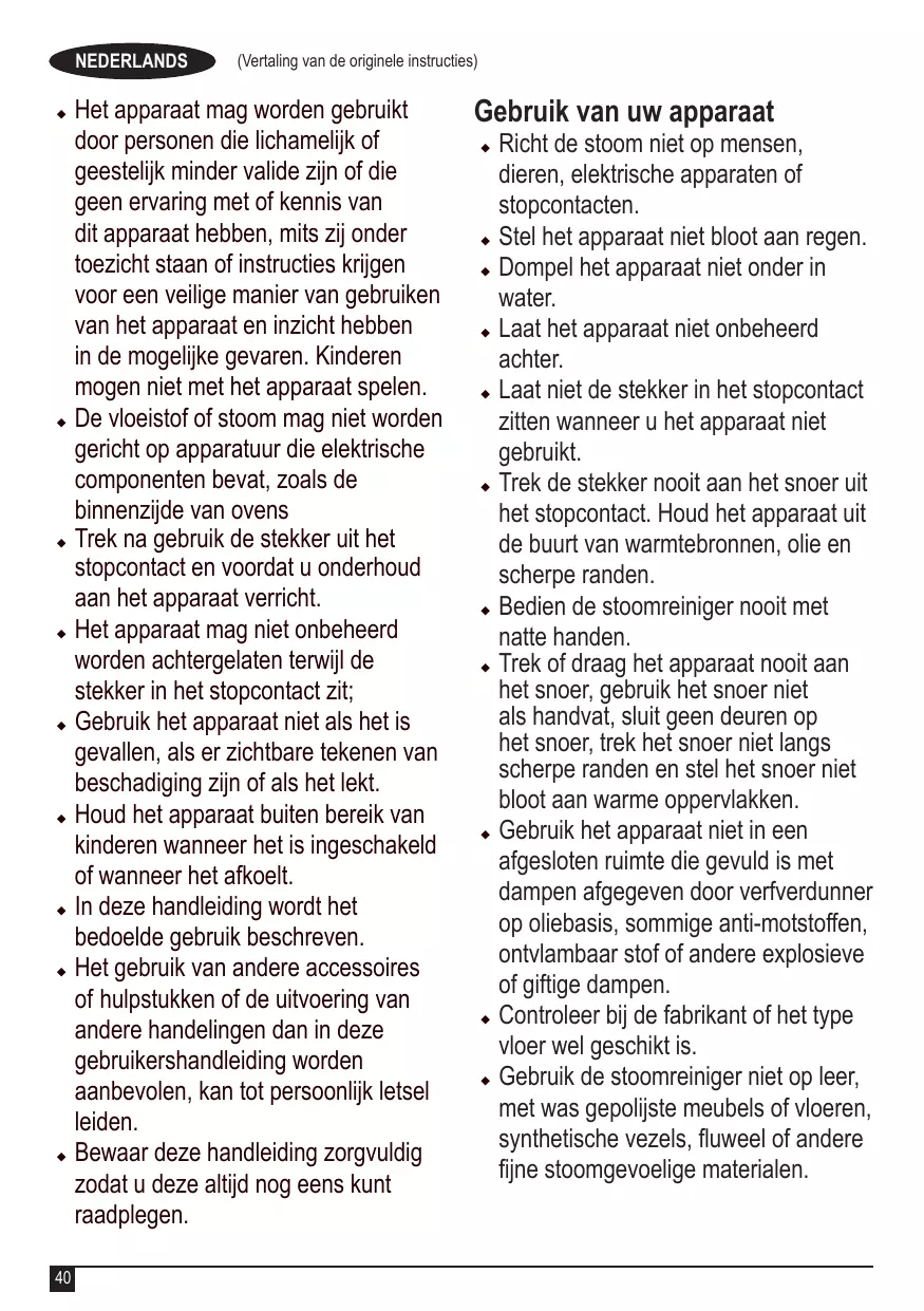Het apparaat mag worden gebruikt door personen die lichamelijk of geestelijk minder valide zijn of die geen ervaring met of kennis van dit apparaat hebben, mits zij onder toezicht staan of instructies krijgen voor een veilige manier van gebruiken van het apparaat en inzicht hebben in de mogelijke gevaren. Kinderen mogen niet met het apparaat spelen. u De vloeistof of stoom mag niet worden gericht op apparatuur die elektrische componenten bevat, zoals de binnenzijde van ovens u Trek na gebruik de stekker uit het stopcontact en voordat u onderhoud aan het apparaat verricht. u Het apparaat mag niet onbeheerd worden achtergelaten terwijl de stekker in het stopcontact zit; u Gebruik het apparaat niet als het is gevallen, als er zichtbare tekenen van beschadiging zijn of als het lekt. u Houd het apparaat buiten bereik van kinderen wanneer het is ingeschakeld of wanneer het afkoelt. u In deze handleiding wordt het bedoelde gebruik beschreven. u Het gebruik van andere accessoires of hulpstukken of de uitvoering van andere handelingen dan in deze gebruikershandleiding worden aanbevolen, kan tot persoonlijk letsel leiden. u Bewaar deze handleiding zorgvuldig zodat u deze altijd nog eens kunt raadplegen. u