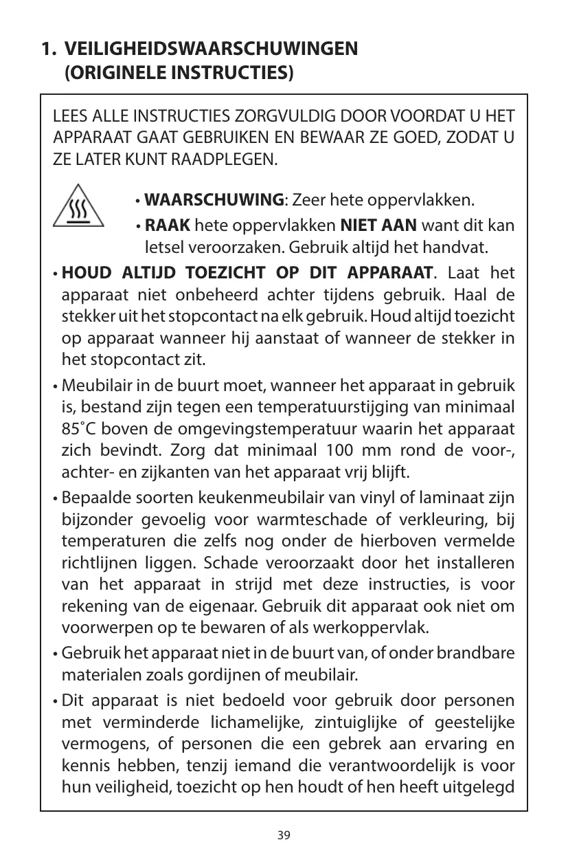 1. VEILIGHEIDSWAARSCHUWINGEN (ORIGINELE INSTRUCTIES) LEES ALLE INSTRUCTIES ZORGVULDIG DOOR VOORDAT U HET APPARAAT GAAT GEBRUIKEN EN BEWAAR ZE GOED, ZODAT U ZE LATER KUNT RAADPLEGEN. • WAARSCHUWING: Zeer hete oppervlakken. • RAAK hete oppervlakken NIET AAN want dit kan letsel veroorzaken. Gebruik altijd het handvat. • HOUD ALTIJD TOEZICHT OP DIT APPARAAT. Laat het apparaat niet onbeheerd achter tijdens gebruik. Haal de stekker uit het stopcontact na elk gebruik. Houd altijd toezicht op apparaat wanneer hij aanstaat of wanneer de stekker in het stopcontact zit. • Meubilair in de buurt moet, wanneer het apparaat in gebruik is, bestand zijn tegen een temperatuurstijging van minimaal 85˚C boven de omgevingstemperatuur waarin het apparaat zich bevindt. Zorg dat minimaal 100 mm rond de voor-, achter- en zijkanten van het apparaat vrij blijft. • Bepaalde soorten keukenmeubilair van vinyl of laminaat zijn bijzonder gevoelig voor warmteschade of verkleuring, bij temperaturen die zelfs nog onder de hierboven vermelde richtlijnen liggen. Schade veroorzaakt door het installeren van het apparaat in strijd met deze instructies, is voor rekening van de eigenaar. Gebruik dit apparaat ook niet om voorwerpen op te bewaren of als werkoppervlak. • Gebruik het apparaat niet in de buurt van, of onder brandbare materialen zoals gordijnen of meubilair. • Dit apparaat is niet bedoeld voor gebruik door personen met verminderde lichamelijke, zintuiglijke of geestelijke vermogens, of personen die een gebrek aan ervaring en kennis hebben, tenzij iemand die verantwoordelijk is voor hun veiligheid, toezicht op hen houdt of hen heeft uitgelegd 39