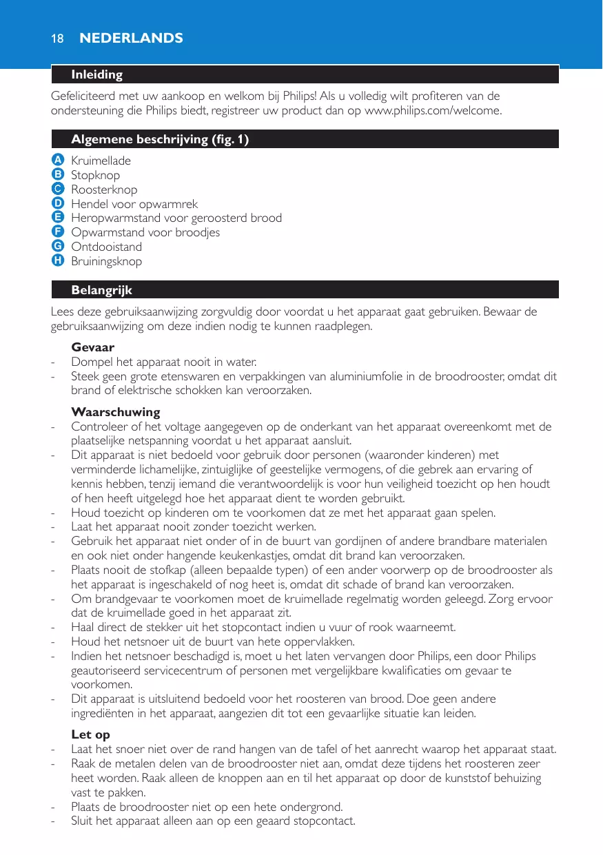 Lees deze gebruiksaanwijzing zorgvuldig door voordat u het apparaat gaat gebruiken. Bewaar de gebruiksaanwijzing om deze indien nodig te kunnen raadplegen. Gevaar -- Dompel het apparaat nooit in water. -- Steek geen grote etenswaren en verpakkingen van aluminiumfolie in de broodrooster, omdat dit brand of elektrische schokken kan veroorzaken. Waarschuwing -- Controleer of het voltage aangegeven op de onderkant van het apparaat overeenkomt met de plaatselijke netspanning voordat u het apparaat aansluit. -- Dit apparaat is niet bedoeld voor gebruik door personen (waaronder kinderen) met verminderde lichamelijke, zintuiglijke of geestelijke vermogens, of die gebrek aan ervaring of kennis hebben, tenzij iemand die verantwoordelijk is voor hun veiligheid toezicht op hen houdt of hen heeft uitgelegd hoe het apparaat dient te worden gebruikt. -- Houd toezicht op kinderen om te voorkomen dat ze met het apparaat gaan spelen. -- Laat het apparaat nooit zonder toezicht werken. -- Gebruik het apparaat niet onder of in de buurt van gordijnen of andere brandbare materialen en ook niet onder hangende keukenkastjes, omdat dit brand kan veroorzaken. -- Plaats nooit de stofkap (alleen bepaalde typen) of een ander voorwerp op de broodrooster als het apparaat is ingeschakeld of nog heet is, omdat dit schade of brand kan veroorzaken. -- Om brandgevaar te voorkomen moet de kruimellade regelmatig worden geleegd. Zorg ervoor dat de kruimellade goed in het apparaat zit. -- Haal direct de stekker uit het stopcontact indien u vuur of rook waarneemt. -- Houd het netsnoer uit de buurt van hete oppervlakken. -- Indien het netsnoer beschadigd is, moet u het laten vervangen door Philips, een door Philips geautoriseerd servicecentrum of personen met vergelijkbare kwalificaties om gevaar te voorkomen. -- Dit apparaat is uitsluitend bedoeld voor het roosteren van brood. Doe geen andere ingrediënten in het apparaat, aangezien dit tot een gevaarlijke situatie kan leiden. Let op -- Laat het snoer niet over de rand hangen van de tafel of het aanrecht waarop het apparaat staat. -- Raak de metalen delen van de broodrooster niet aan, omdat deze tijdens het roosteren zeer heet worden. Raak alleen de knoppen aan en til het apparaat op door de kunststof behuizing vast te pakken. -- Plaats de broodrooster niet op een hete ondergrond. -- Sluit het apparaat alleen aan op een geaard stopcontact.