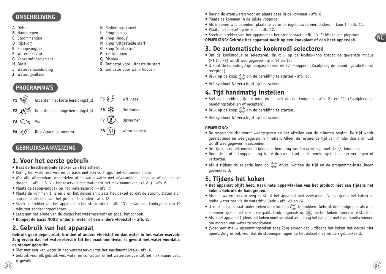 Ajustez le temps de cuisson en fonction de la quantité des aliments utilisés. Pour cuire des aliments aux temps de cuisson différents: placez l’aliment qui requiert le temps de cuisson le plus long dans le bol du bas. Pendant la cuisson, ajoutez le 2e bol avec l’aliment qui requiert un temps de cuisson plus court, puis si besoin le 3e panier avec l’aliment qui se cuit le plus rapidement. Utilisez toujours des protections pour manipuler le couvercle et les bols pendant la cuisson.