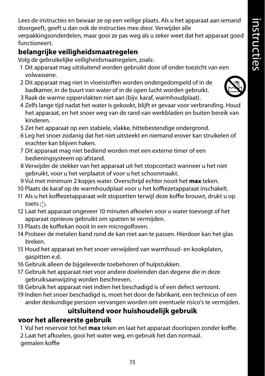 3 Ne touchez pas les surfaces chaudes ( la carafe, la plaque chauffante). 4 Le risque de brûlure persiste longtemps après ébullition. Tenez l’appareil et le câble loin des bords des surfaces de travail et hors de portée des enfants. 5 Posez l’appareil sur une surface stable, à niveau et résistante à la chaleur. 6 Branchez le cordon de sorte qu’il ne pende pas et qu’il n’y ait aucun risque de trébucher dessus. 7 Cet appareil ne doit pas être utilisé avec un minuteur externe ou un système de contrôle à distance. 8 Débranchez l’appareil lorsque vous ne l’utilisez pas, avant de le déplacer et avant de le nettoyer. 9 Remplissez le réservoir avec 2 tasses au minimum, mais sans dépasser la marque max. 10 Placez la carafe sur la plaque chauffante avant d’allumer la cafetière. 11 Si vous voulez arrêter la machine pendant la préparation du café, appuyez sur le bouton 2. 12 Laissez l’appareil refroidir au moins 10 minutes avant de rajouter de l’eau ou de le réutiliser afin d’éviter toute projection. 13 Ne mettez pas la carafe au four micro-ondes. 14 N’essayez pas de régler la bande métallique autour de la carafe, le verre casserait. 15 Placez l’appareil et le cordon loin des plaques chauffantes, des plans de cuisson ou des brûleurs. 16 N’adaptez pas d’accessoires autres que ceux fournis. 17 N’utilisez pas l’appareil à d’autres fins que celles décrites dans ce mode d’emploi. 18 N’utilisez pas l’appareil s’il est endommagé ou s’il ne fonctionne pas correctement. 19 Si le câble est abîmé, vous devez le faire remplacer par le fabricant, un de ses techniciens agréés ou une personne également qualifiée, pour éviter tout danger.