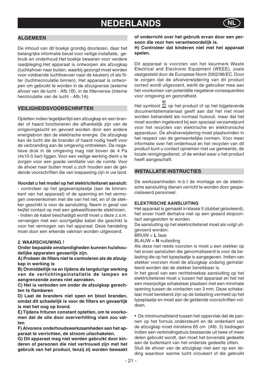 NEDERLANDS ALGEMEEN De inhoud van dit boekje grondig doorlezen, daar het belangrijke informatie bevat voor veilige installatie, gebruik en onderhoud.Het boekje bewaren voor verdere raadpleging.Het apparaat is ontworpen als afzuigkap (Iuchtafvoer naar buiten, waarbij gezorgd moet worden voor voldoende luchttoevoer naar de keuken) of als filter (Iuchtrecirculatie binnen). Het apparaat is ontworpen om gebruikt te worden in de afzuigversie (externe afvoer van de lucht - Afb.1B), in de filterversie (interne hercirculatie van de lucht - Afb.1A). VEILIGHEIDSVOORSCHRIFTEN Opletten indien tegelijkertijd een afzuigkap en een brander of haard functioneren die afhankelijk zijn van de omgevingslucht en gevoed worden door een andere energiebron dan de elektrische energie. De afzuigkap kan de lucht die de brander of haard nodig heeft voor de verbranding aan de omgeving onttrekken. De negatieve druk in de omgeving mag niet boven de 4 Pa (4x10-5 bar) liggen. Voor een veilige werking dient u te zorgen voor een goede ventilatie van de ruimte. Voor de afvoer naar buiten moet u zich houden aan de geldende voorschriften die van toepassing zijn in uw land. Voordat u het model op het elektriciteitsnet aansluit: - controleer op het gegevensplaatje (aan de binnenkant van het apparaat) of de spanning en het vermogen overeenkomen met die van het net, en of de stekker geschikt is voor de aansluiting. Neem in geval van twijfel contact op met een gekwalificeerde elektricien. - Indien de kabel beschadigd wordt moet u deze z.s.m. vervangen met een soortgelijke kabel die geschikt is voor het vermogen van het apparaat. Deze handeling moet door een erkende vakman worden uitgevoerd.