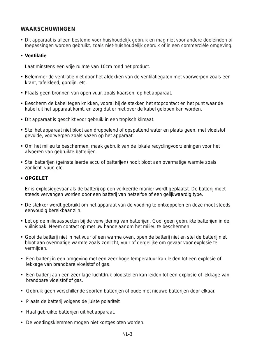 AVERTISSEMENTS 3 DESCRIPTION DU PRODUIT5 ASSEMBLAGE 7 TÉ LÉ COMMANDE 8 Il convient de ne pas placer sur l’appareil de sources de flammes nues, telles que des bougies allumées. Disposez le cordon d’alimentation de manière à ce qu'il ne puisse être ni piétiné ni pincé, notamment au niveau de sa fiche, de la prise de courant et de l’endroit d’où il sort de l'appareil. Cet appareil n'est pas destine à être utilisé sous un climat tropical. L’appareil ne doit pas être exposé á des égouttements d'eau ou des éclaboussures et de plus qu'aucun objet rempli de liquide tel que des vases ne doit être placé sur l’ appareil. Déposez vos piles usagées auprès d'installation de recyclage pour protéger notre environnement. Les piles (piles installées) ne doivent pas être exposées à une chaleur excessive telle que celle du soleil, d'un feu ou d'origine similaire. ATTENTION Danger d'explosion si la pile n’est pas remplacée correctement. Ne remplacer que par le même type ou un type équivalent. La fiche SECTEUR est utilisée comme dispositif de déconnexion ; le dispositif de déconnexion doit rester facilement accessible. Mise au rebut d’une batterie dans un feu ou dans un four chaud, ou écrasement mécanique ou coupure d’une batterie ou être exposées à une chaleur excessive telle que celle du soleil, d'un feu ou d'origine similaire, susceptible de provoquer une explosion. Maintien d’une batterie dans un environnement à très haute température pouvant provoquer une explosion ou la fuite de liquide ou de gaz inflammables. La batterie soumise à une pression de l’air extrêmement faible pouvant provoquer une explosion ou la fuite de liquide ou de gaz inflammables. Différents types de pile ne doivent pas être mélangées. Des piles neuves ne doivent pas être mélangées à des piles usagées. Les piles doivent être installées en respectant la polarité +/-. Les piles usagées doivent être enlevées de l'appareil. Ne pas court-circuiter les piles.