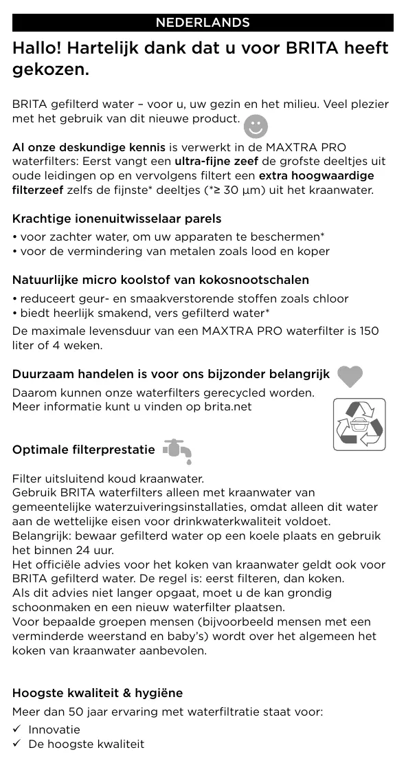 Plus de 50 ans d’expérience dans le domaine de la filtration : 9 innovation 9 qualité maximale Afin de garantir ces exigences de haute qualité, nous appliquons des contrôles de qualité internes et externes très rigoureux. Chaque filtre à eau MAXTRA PRO est traité à la vapeur pour une hygiène optimale et est placé sous emballage individuel de protection (remarque : ce traitement entraine de la condensation lors de l‘ensachage qui peut rendre le filtre à eau MAXTRA PRO humide). Le matériau filtrant du filtre à eau MAXTRA PRO subit un traitement spécial à l‘argent pour des raisons d‘hygiène. Une petite quantité d‘argent peut être libérée dans l‘eau. Ceci est conforme aux recommandations de l‘Organisation mondiale de la santé (OMS). BRITA vous recommande de remplacer le filtre à eau MAXTRA PRO toutes les 4 semaines pour une filtration optimale. Veuillez suivre les indications de nettoyage recommandées et les conseils de préparation du filtre (chapitres 1-7). La carafe doit être nettoyée toutes les semaines.