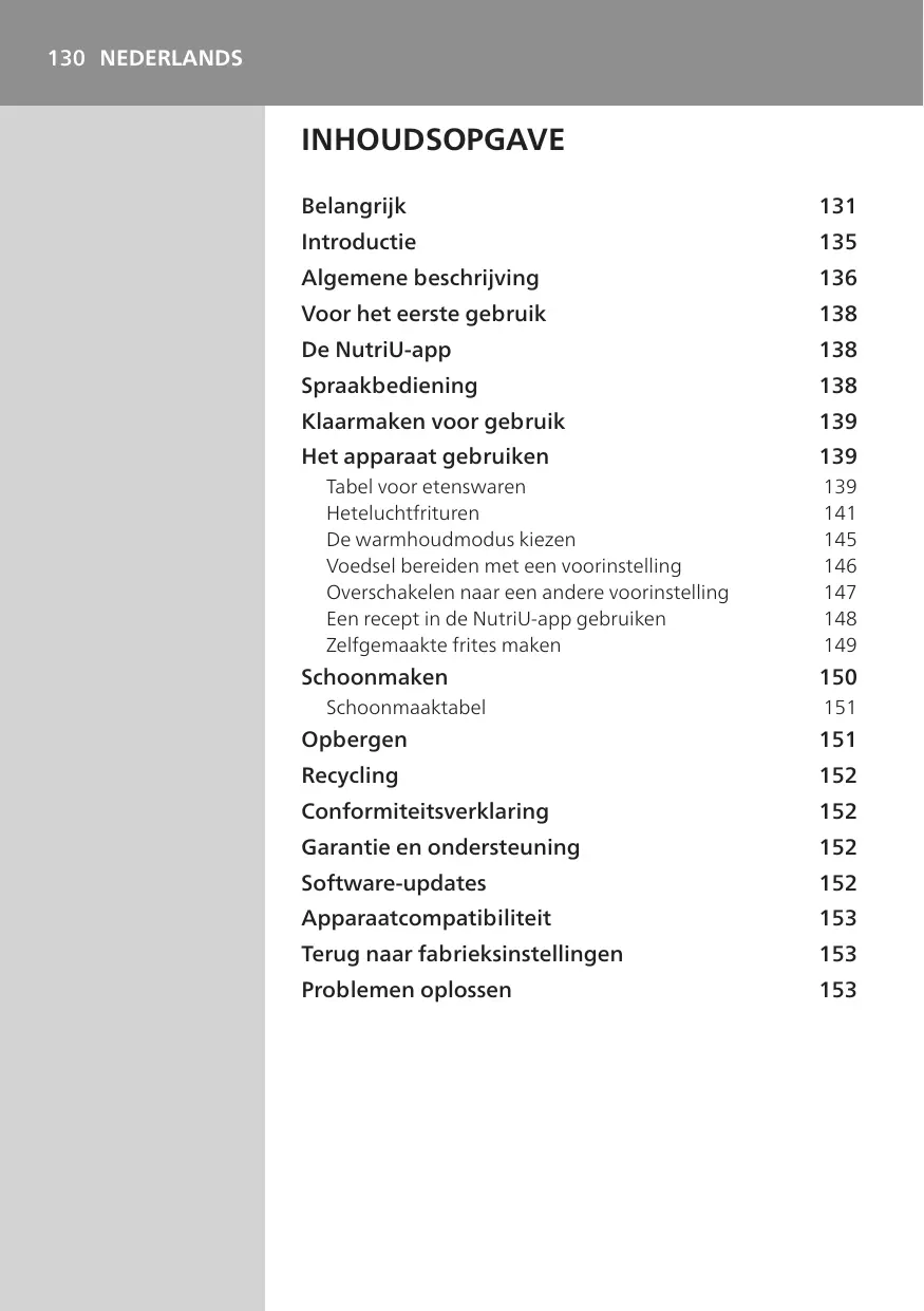 2 Controleer of uw smartapparaat zich binnen het bereik van uw Wi-Fi-thuisnetwerk bevindt voordat u start met het eenvoudige Wi-Fi-configuratieproces. 3 Download de Philips NutriU-app via de App Store of www.philips.com/nutriu naar uw smartapparaat, voer de registratie uit en selecteer de verbonden Airfryer in uw profiel onder “Mijn apparaten”. 4 Volg de instructies in de app om de Airfryer met uw Wi-Finetwerk te verbinden en te koppelen met de app. 5 Zodra de Wi-Fi-LED op de Airfryer blijft branden, is de Airfryer verbonden.