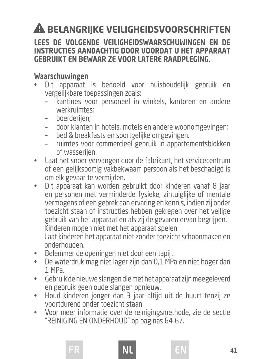 • Dit apparaat kan worden gebruikt door kinderen vanaf 8 jaar en personen met verminderde fysieke, zintuiglijke of mentale vermogens of een gebrek aan ervaring en kennis, indien zij onder toezicht staan of instructies hebben gekregen over het veilige gebruik van het apparaat en als zij de gevaren ervan begrijpen. Kinderen mogen niet met het apparaat spelen. Laat kinderen het apparaat niet zonder toezicht schoonmaken en onderhouden.