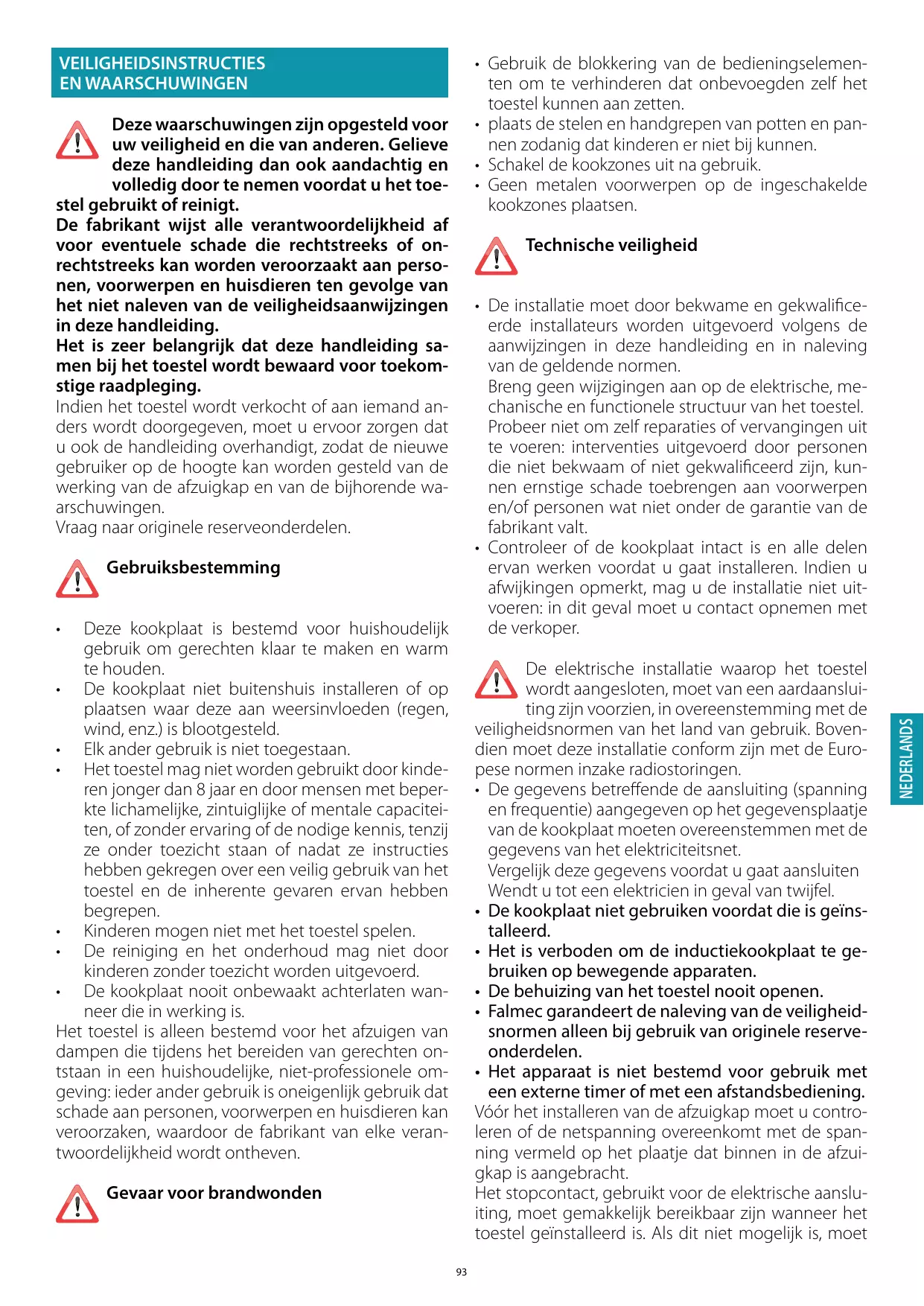 Ne jamais ouvrir l’enveloppe de l’appareil. Falmec assure le respect des standards de sécurité seulement sur des pièces de rechange originales. L'appareil n’est pas destiné au fonctionnement avec un minuteur externe ou télécommande.