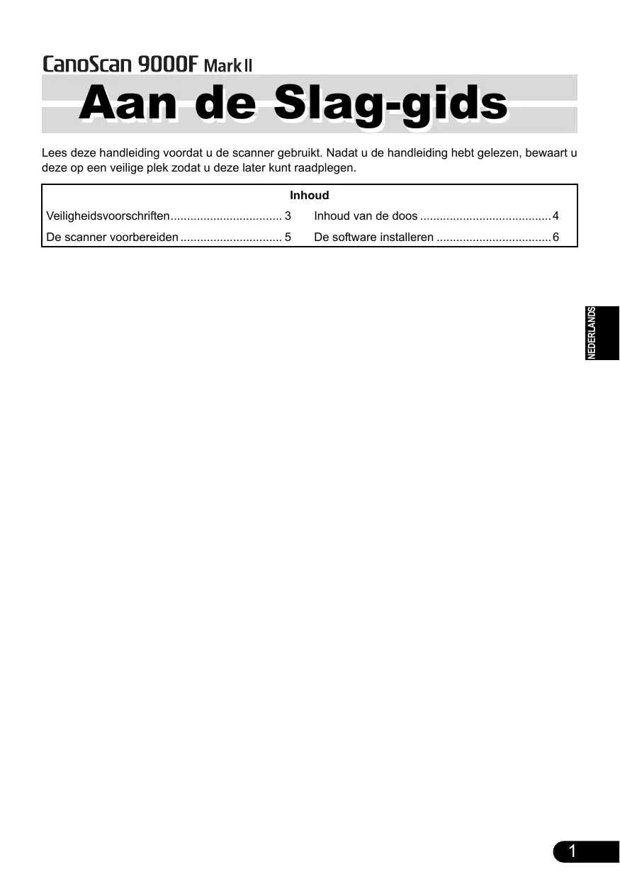 Aan de Slag-gids Lees deze handleiding voordat u de scanner gebruikt. Nadat u de handleiding hebt gelezen, bewaart u deze op een veilige plek zodat u deze later kunt raadplegen.