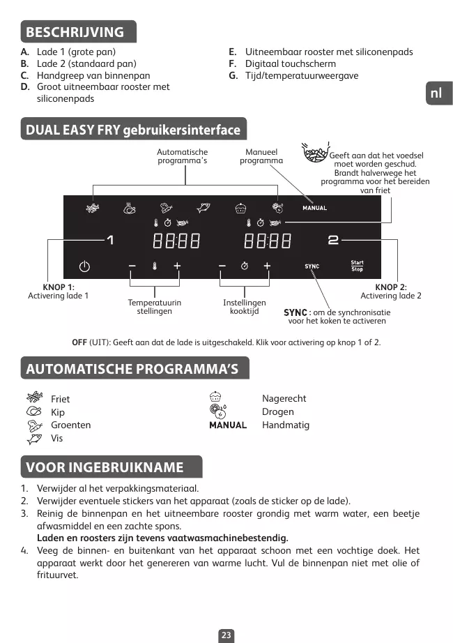 1. Stellen Sie das Gerät auf eine ebene, feste und hitzebeständige Arbeitsfläche geschützt vor Wasserspritzern auf. Anmerkung: Die unten aufgeführten Garzeiten sind nur eine Orientierungshilfe und können je nach Sorte und Menge der verwendeten Kartoffeln variieren. Bei anderen Lebensmitteln können die Größe, Form und Marke das Ergebnis beeinflussen. Sie müssen daher eventuell die Garzeit leicht anpassen. 1. Ziehen Sie den Stecker des Geräts und lassen Sie das Gerät abkühlen. 2. Achten Sie darauf, dass alle Elemente sauber und trocken sind. • Druk op de om het bakproces met de gekozen temperatuur en tijd te starten. • Het bakproces start. De resterende baktijd wordt op het scherm weergegeven. 5. Overtollig olie van de ingrediënten wordt in de onderkant van de binnenpan opgevangen. 6. Voor bepaalde ingrediënten is het nodig om ze op de helft van de baktijd te schudden (zie de sectie “Kookgids”). Om de ingrediënten te schudden, trek de binnenpan via de handgreep uit het apparaat en schud de binnenpan. Schuif vervolgens de binnenpan terug in het apparaat en de bereiding start automatisch opnieuw. Als de kookmodus voor friet is ingeschakeld, knippert dit pictogram halverwege het programma. Dit geeft aan dat de friet moet worden geschud voor gelijkmatige bereiding. 7. Als de baktijd is verstreken, hoort u een geluidssignaal en wordt het apparaat uitgeschakeld. Trek de binnenpan uit het apparaat en plaats het op een warmtebestendig oppervlak. 8. Controleer of de ingrediënten gaar zijn. Eenmaal de ingrediënten nog niet gaar zijn, schuif de binnenpan opnieuw in het apparaat en stel de timer nog enkele minuten in. 9. Eenmaal de ingrediënten gaar zijn, haal de binnenpan uit het apparaat. Gebruik een tang om de ingrediënten uit de binnenpan te halen. Opgelet: Als u de binnenpan omdraait, kan er olie, die zich op de bodem van de binnenpan bevindt, op de ingrediënten druppelen en kan het rooster uit het apparaat vallen. De binnenpan, het rooster en de ingrediënten zijn na het frituren zeer warm. 10. Na het bereiden van ingrediënten, kan het apparaat onmiddellijk opnieuw gebruikt worden. 25 Indica la necesidad de agitar (remover) la comida. Se ilumina a mitad del cocinado para el programa de patatas fritas.