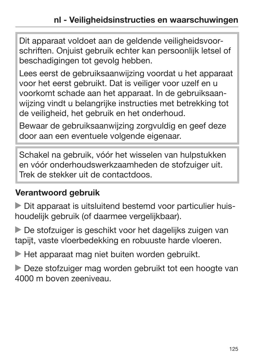 nl - Veiligheidsinstructies en waarschuwingen Dit apparaat voldoet aan de geldende veiligheidsvoorschriften. Onjuist gebruik echter kan persoonlijk letsel of beschadigingen tot gevolg hebben. Lees eerst de gebruiksaanwijzing voordat u het apparaat voor het eerst gebruikt. Dat is veiliger voor uzelf en u voorkomt schade aan het apparaat. In de gebruiksaanwijzing vindt u belangrijke instructies met betrekking tot de veiligheid, het gebruik en het onderhoud. Bewaar de gebruiksaanwijzing zorgvuldig en geef deze door aan een eventuele volgende eigenaar. Schakel na gebruik, vóór het wisselen van hulpstukken en vóór onderhoudswerkzaamheden de stofzuiger uit. Trek de stekker uit de contactdoos. Verantwoord gebruik Dit apparaat is uitsluitend bestemd voor particulier huishoudelijk gebruik (of daarmee vergelijkbaar). De stofzuiger is geschikt voor het dagelijks zuigen van tapijt, vaste vloerbedekking en robuuste harde vloeren. Het apparaat mag niet buiten worden gebruikt. Deze stofzuiger mag worden gebruikt tot een hoogte van 4000 m boven zeeniveau.