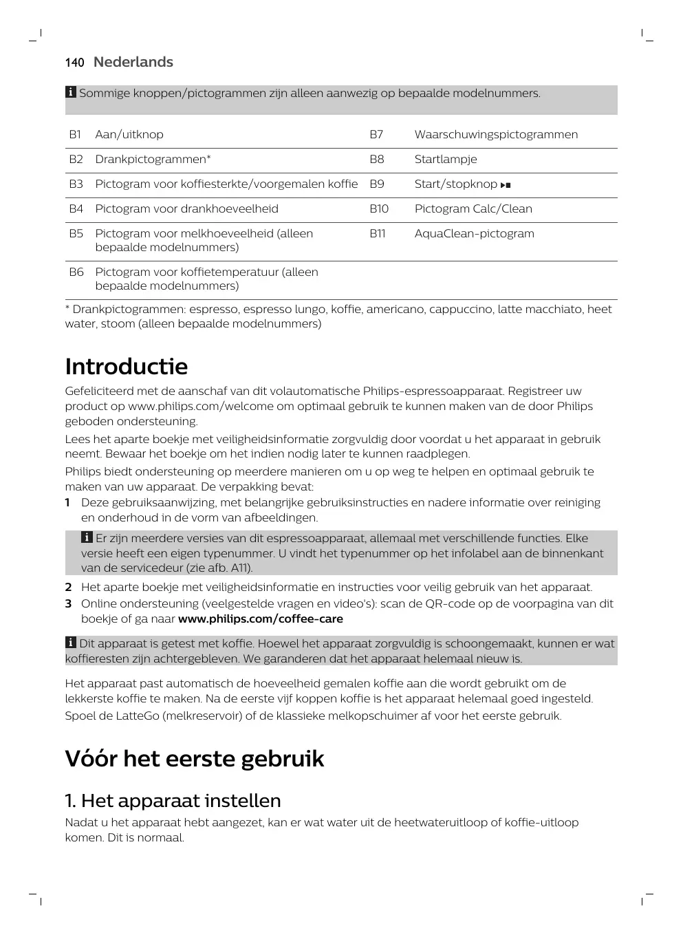 Hay varias versiones de esta cafetera expreso, todas ellas con funciones distintas. Cada versión tiene un número de tipo. Puede encontrar el número de tipo en la etiqueta de datos que se encuentra dentro de la puerta de mantenimiento (consulte la Fig. A11). 2 El folleto de seguridad adjunto con instrucciones sobre cómo usar el aparato de forma segura. 3 Para obtener ayuda en línea (preguntas frecuentes, vídeos, etc.), escanee el código QR de la portada de este folleto o visite www.philips.com/coffee-care Este aparato se ha probado con café. Aunque se ha limpiado cuidadosamente, es posible que quede algún residuo de café. Le garantizamos, no obstante, que el aparato es absolutamente nuevo. El aparato ajusta automáticamente la cantidad de café molido que se utiliza para hacer un café con el mejor sabor. Debe preparar 5 cafés al principio para permitir que la máquina complete su ajuste automático. Asegúrese de enjuagar el LatteGo (el depósito de leche) o el espumador de leche clásico antes de utilizarlo por primera vez.