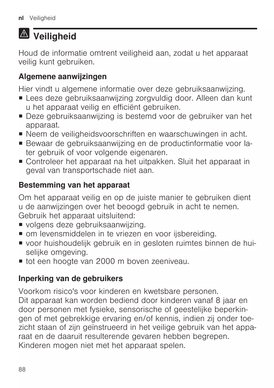 Veiligheid Houd de informatie omtrent veiligheid aan, zodat u het apparaat veilig kunt gebruiken. Algemene aanwijzingen Hier vindt u algemene informatie over deze gebruiksaanwijzing. ¡ Lees deze gebruiksaanwijzing zorgvuldig door. Alleen dan kunt u het apparaat veilig en efficiënt gebruiken. ¡ Deze gebruiksaanwijzing is bestemd voor de gebruiker van het apparaat. ¡ Neem de veiligheidsvoorschriften en waarschuwingen in acht. ¡ Bewaar de gebruiksaanwijzing en de productinformatie voor later gebruik of voor volgende eigenaren. ¡ Controleer het apparaat na het uitpakken. Sluit het apparaat in geval van transportschade niet aan. Bestemming van het apparaat Om het apparaat veilig en op de juiste manier te gebruiken dient u de aanwijzingen over het beoogd gebruik in acht te nemen. Gebruik het apparaat uitsluitend: ¡ volgens deze gebruiksaanwijzing. ¡ om levensmiddelen in te vriezen en voor ijsbereiding. ¡ voor huishoudelijk gebruik en in gesloten ruimtes binnen de huiselijke omgeving. ¡ tot een hoogte van 2000 m boven zeeniveau. Inperking van de gebruikers Voorkom risico's voor kinderen en kwetsbare personen. Dit apparaat kan worden bediend door kinderen vanaf 8 jaar en door personen met fysieke, sensorische of geestelijke beperkingen of met gebrekkige ervaring en/of kennis, indien zij onder toezicht staan of zijn geïnstrueerd in het veilige gebruik van het apparaat en de daaruit resulterende gevaren hebben begrepen. Kinderen mogen niet met het apparaat spelen. 88