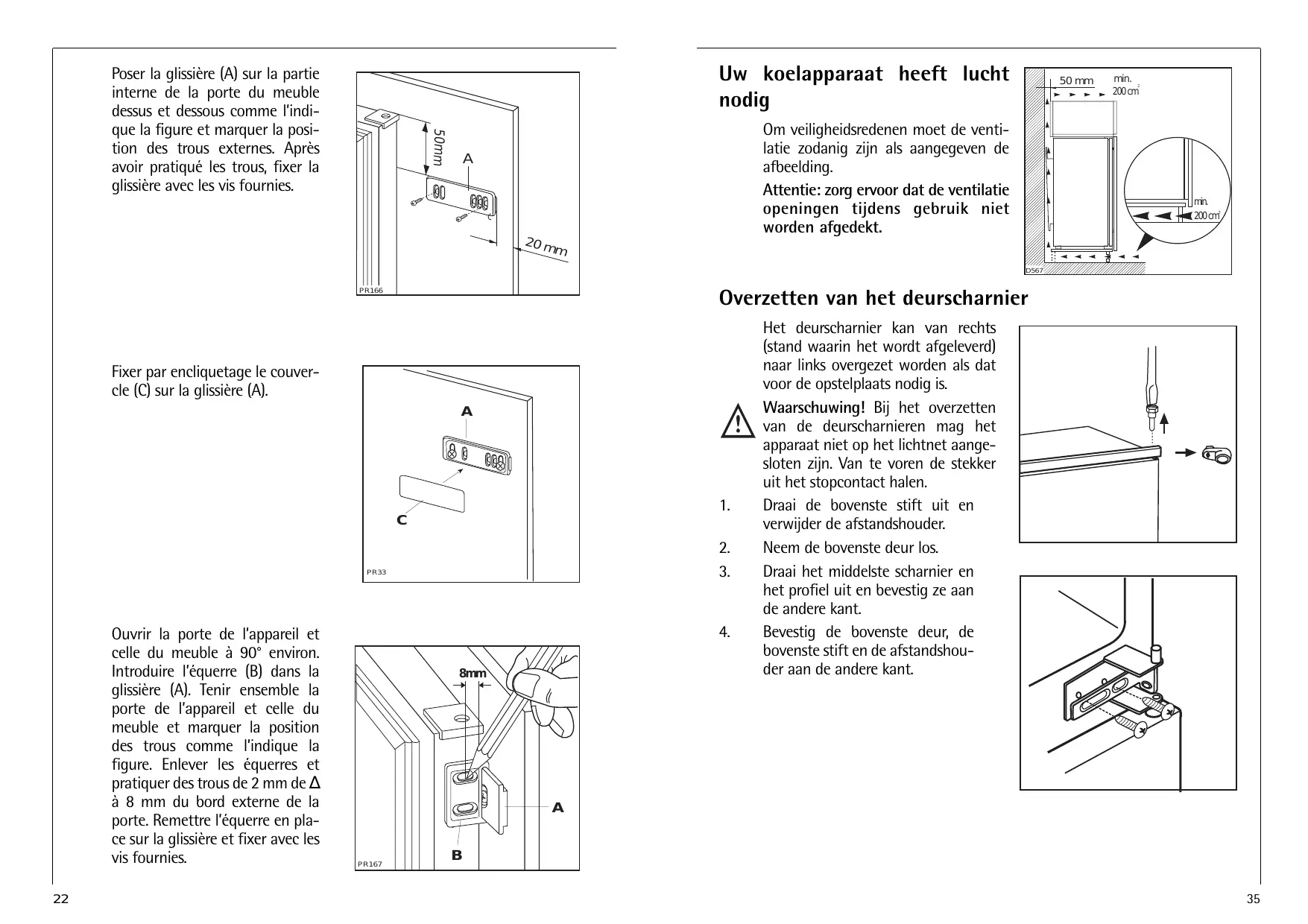 Het deurscharnier kan van rechts (stand waarin het wordt afgeleverd) naar links overgezet worden als dat voor de opstelplaats nodig is. Waarschuwing! Bij het overzetten van de deurscharnieren mag het apparaat niet op het lichtnet aangesloten zijn. Van te voren de stekker uit het stopcontact halen. Draai de bovenste stift uit en verwijder de afstandshouder. Neem de bovenste deur los. Draai het middelste scharnier en het profiel uit en bevestig ze aan de andere kant. Bevestig de bovenste deur, de bovenste stift en de afstandshouder aan de andere kant.