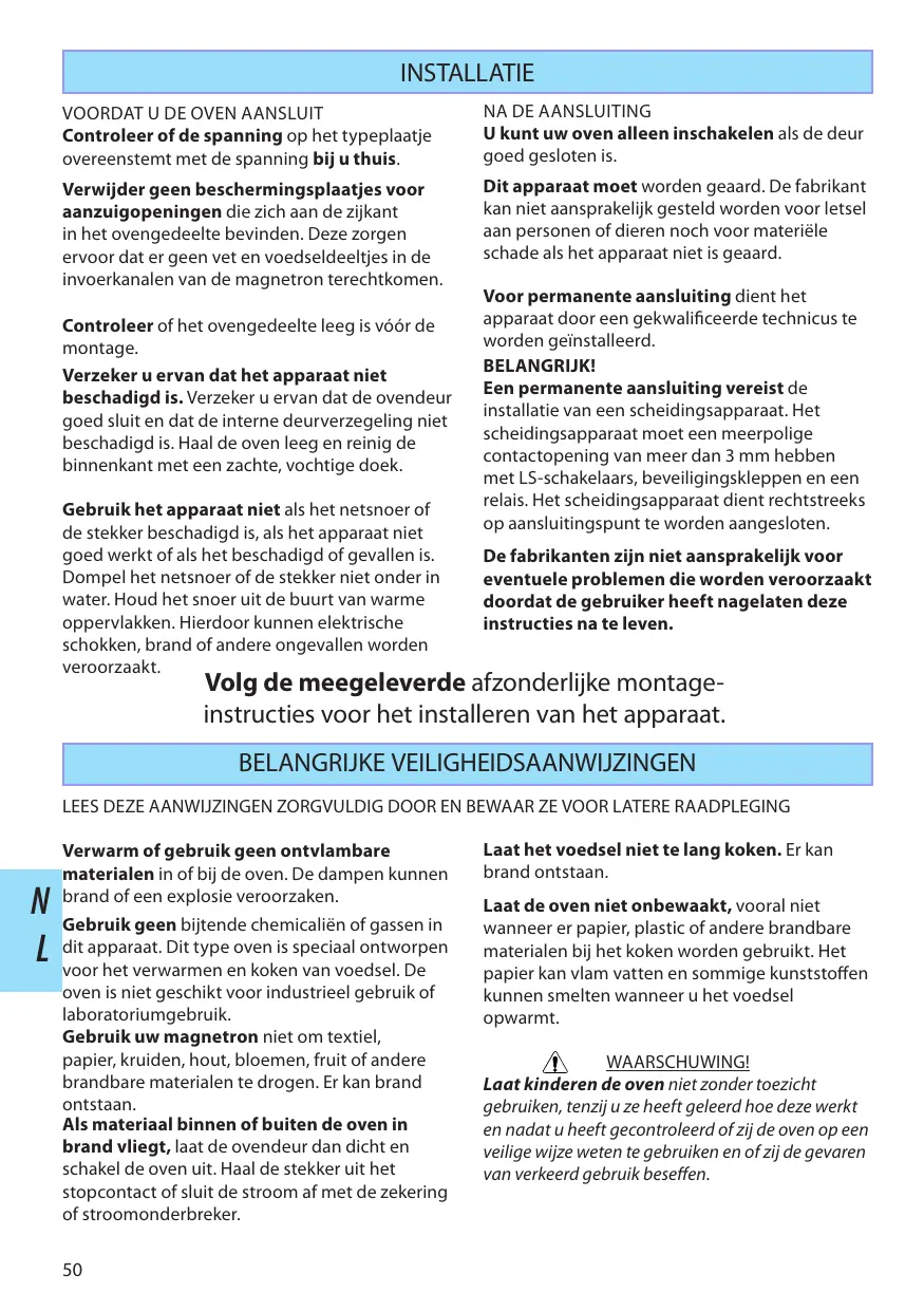 U kunt uw oven alleen inschakelen als de deur goed gesloten is. Verwijder geen beschermingsplaatjes voor aanzuigopeningen die zich aan de zijkant in het ovengedeelte bevinden. Deze zorgen ervoor dat er geen vet en voedseldeeltjes in de invoerkanalen van de magnetron terechtkomen. Dit apparaat moet worden geaard. De fabrikant kan niet aansprakelijk gesteld worden voor letsel aan personen of dieren noch voor materiële schade als het apparaat niet is geaard. Controleer of het ovengedeelte leeg is vóór de montage. Verzeker u ervan dat het apparaat niet beschadigd is. Verzeker u ervan dat de ovendeur goed sluit en dat de interne deurverzegeling niet beschadigd is. Haal de oven leeg en reinig de binnenkant met een zachte, vochtige doek. Gebruik het apparaat niet als het netsnoer of de stekker beschadigd is, als het apparaat niet goed werkt of als het beschadigd of gevallen is. Dompel het netsnoer of de stekker niet onder in water. Houd het snoer uit de buurt van warme oppervlakken. Hierdoor kunnen elektrische schokken, brand of andere ongevallen worden veroorzaakt. Voor permanente aansluiting dient het apparaat door een gekwalificeerde technicus te worden geïnstalleerd. BELANGRIJK! Een permanente aansluiting vereist de installatie van een scheidingsapparaat. Het scheidingsapparaat moet een meerpolige contactopening van meer dan 3 mm hebben met LS-schakelaars, beveiligingskleppen en een relais. Het scheidingsapparaat dient rechtstreeks op aansluitingspunt te worden aangesloten. De fabrikanten zijn niet aansprakelijk voor eventuele problemen die worden veroorzaakt doordat de gebruiker heeft nagelaten deze instructies na te leven. Volg de meegeleverde afzonderlijke montageinstructies voor het installeren van het apparaat. BELANGRIJKE VEILIGHEIDSAANWIJZINGEN LEES DEZE AANWIJZINGEN ZORGVULDIG DOOR EN BEWAAR ZE VOOR LATERE RAADPLEGING