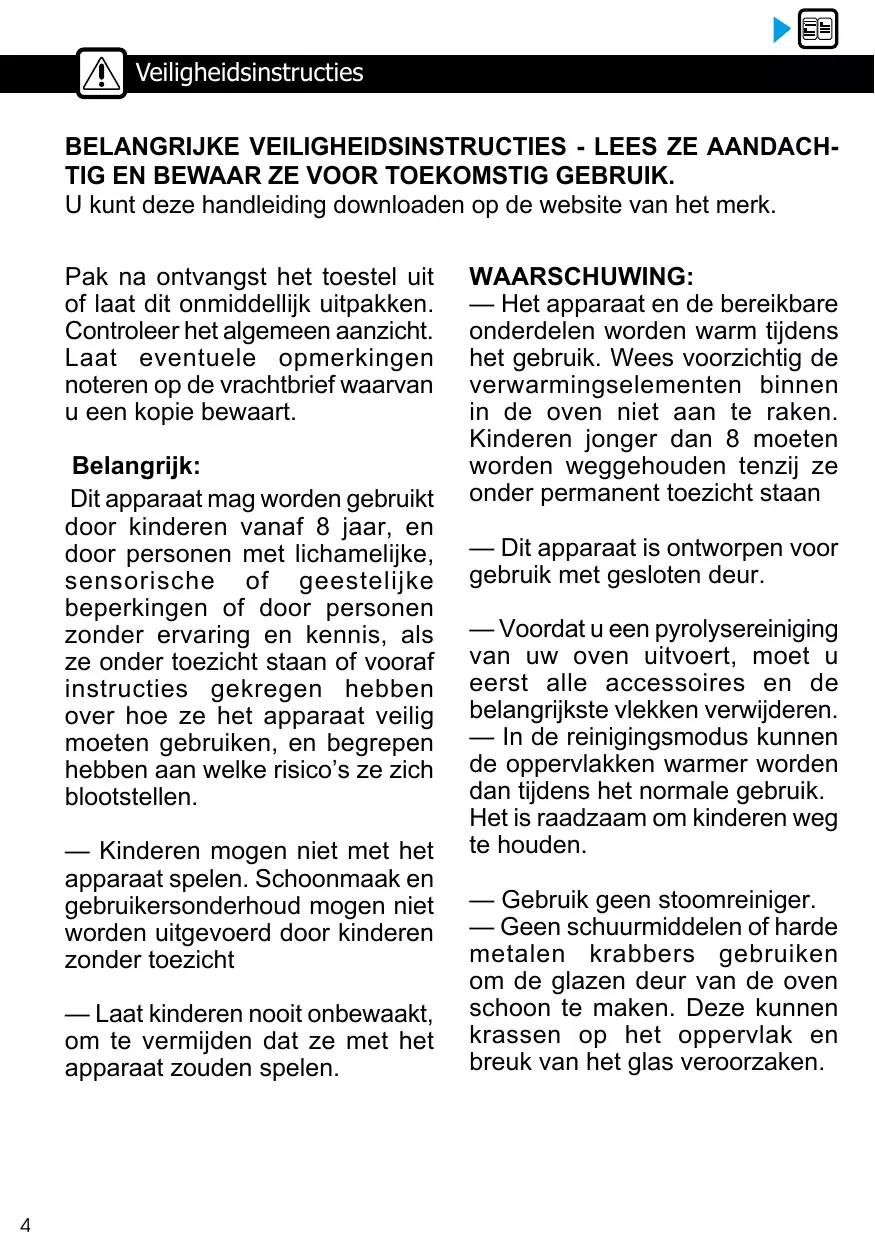 WAARSCHUWING: — Het apparaat en de bereikbare onderdelen worden warm tijdens het gebruik. Wees voorzichtig de verwarmingselementen binnen in de oven niet aan te raken. Kinderen jonger dan 8 moeten worden weggehouden tenzij ze onder permanent toezicht staan — Dit apparaat is ontworpen voor gebruik met gesloten deur. — Voordat u een pyrolysereiniging van uw oven uitvoert, moet u eerst alle accessoires en de belangrijkste vlekken verwijderen. — In de reinigingsmodus kunnen de oppervlakken warmer worden dan tijdens het normale gebruik. Het is raadzaam om kinderen weg te houden. — Gebruik geen stoomreiniger. — Geen schuurmiddelen of harde metalen krabbers gebruiken om de glazen deur van de oven schoon te maken. Deze kunnen krassen op het oppervlak en breuk van het glas veroorzaken.