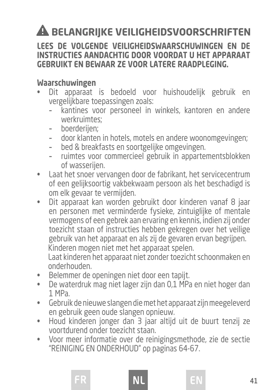 - Dit apparaat kan worden gebruikt door kinderen vanaf 8 jaar en personen met verminderde fysieke, zintuiglijke of mentale vermogens of een gebrek aan ervaring en kennis, indien zij onder toezicht staan of instructies hebben gekregen over het veilige gebruik van het apparaat en als zij de gevaren ervan begrijpen. Kinderen mogen niet met het apparaat spelen. Laat kinderen het apparaat niet zonder toezicht schoonmaken en onderhouden.