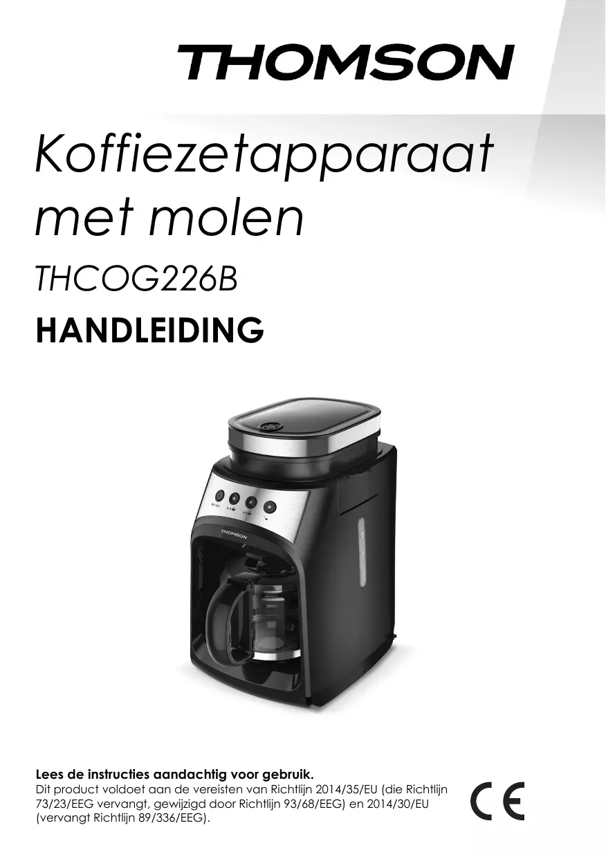 Do not put any part of your coffee maker in the dishwasher. Clean the exterior of your device with a soft cloth. Clean the detachable parts in hot water with washing-up liquid then rinse. Before putting them back in place, be sure to dry them thoroughly. TECHNICAL DESCRIPTION Voltage: 220-240V~ Frequency: 50/60Hz Power: 600W Capacity: 0.6L FR-11 Defects due to improper use of the device and damage due to intervention or repair by a third party or due to the installation of non-original parts are not covered by the liability of the vendor. This logo affixed to the product means that it is a device whose treatment as waste falls within the scope of Directive 2012/19/EU, relating to waste electrical and electronic equipment (WEEE). The presence of hazardous substances in electrical and electronic equipment can have potential effects on the environment and health human in the reprocessing cycle of this product. Thus, at the end of the life of this device, it must not be disposed of with unsorted municipal waste. As the end consumer, your role is essential in the cycle of reuse, recycling and other forms of recovery of this electrical and electronic equipment. Recovery and collection systems are made available to you by local authorities (waste centres) and distributors. You have the obligation to use the selective collection systems made available to you. The warranty does not cover product wear parts, problems or damage resulting from: (1) surface damage due to normal wear of the product; (2) defects or deterioration due to contact of the product with liquids and due to corrosion caused by rust or the presence of insects; (3) any incident, abuse, misuse, unauthorized modification, disassembly or repair; (4) any improper maintenance, use not in accordance with the product instructions or connection to an incorrect voltage; (5) any use of accessories not supplied or approved by the manufacturer. The warranty will be void if the nameplate and/or serial number of the product is removed THOMSON is a trademark of Technicolor SA used under license by SCHNEIDER CONSUMER GROUP. This product is imported by SCHNEIDER CONSUMER GROUP, 12 rue Jules Ferry, 93110 ROSNY-SOUS-BOIS, FRANCE Koffiezetapparaat met molen THCOG226B HANDLEIDING Lees de instructies aandachtig voor gebruik. Dit product voldoet aan de vereisten van Richtlijn 2014/35/EU (die Richtlijn 73/23/EEG vervangt, gewijzigd door Richtlijn 93/68/EEG) en 2014/30/EU (vervangt Richtlijn 89/336/EEG). VEILIGHEIDSINSTRUCTIES