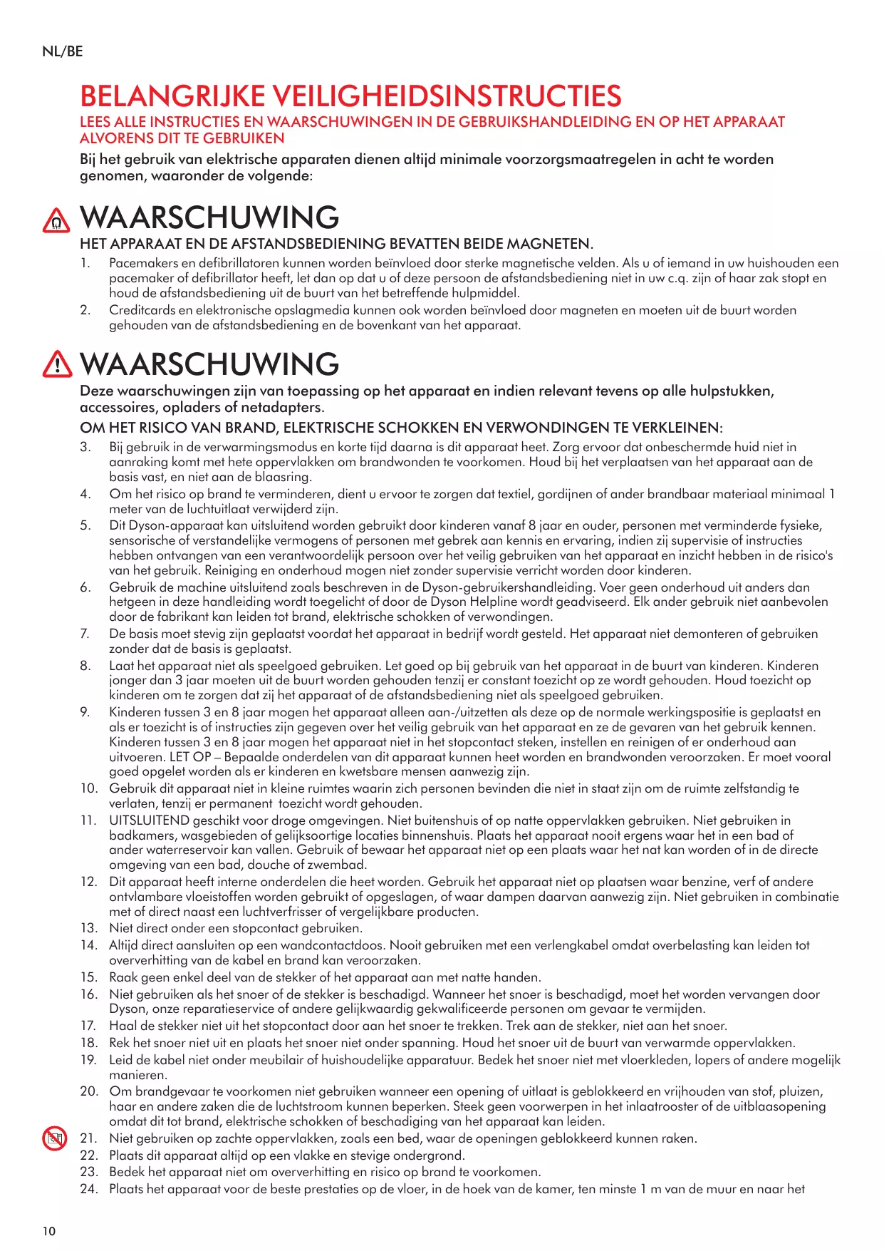3. Cet appareil Dyson peut être utilisé par les enfants à partir de 8 ans et les personnes dont les capacités physiques, sensorielles ou mentales sont réduites, ou manquant d’expérience ou de connaissances, uniquement s’ils sont supervisés ou qu’ils ont reçu des instructions de la part d’une personne responsable concernant l’utilisation de l’appareil en toute sécurité, et qu’ils comprennent les dangers associés. Le nettoyage et l’entretien ne doivent pas être réalisés par des enfants non supervisés. Utilisez l’appareil uniquement tel que décrit dans le manuel de l’utilisateur Dyson.N’effectuez pas de travaux d’entretien autres que ceux indiqués dans ce mode d’emploi Dyson ou que ceux conseillés par le Service consommateurs Dyson. Toute autre utilisation non recommandée par le fabricant peut entraîner un incendie, une décharge électrique ou des blessures. La base doit être solidement fixée avant que l’appareil soit mis en marche. Ne démontez pas l’appareil et ne l’utilisez pas si la base n’est pas fixée. Cet appareil n’est pas un jouet. Faites preuve de prudence lorsqu’il est utilisé par des enfants ou à proximité d’enfants. Ne laissez pas l’appareil à proximité d’enfants de moins de 3 ans à moins qu’ils ne soient constamment sous surveillance. Surveillez les enfants pour vous assurer qu’ils ne jouent pas avec l’appareil ou la télécommande. Les enfants âgés de 3 ans à 8 ans ne peuvent allumer/éteindre l’appareil que s’il a été placé ou installé dans sa position normale d’utilisation et s'ils sont supervisés ou ont reçu des instructions concernant l’utilisation de l’appareil en toute sécurité, et qu’ils comprennent les risques encourus. Les enfants âgés de 3 ans à moins de 8 ans ne doivent pas brancher l’appareil, le régler ou le nettoyer, et ne doivent pas réaliser les opérations de maintenance à la charge de l’utilisateur. ATTENTION – Certains éléments de ce produit peuvent devenir très chauds et provoquer des brûlures. Faites particulièrement attention en présence d’enfants ou de personnes vulnérables. N’utilisez pas cet appareil dans des petites pièces dans lesquelles se trouvent des personnes incapables d’en sortir par leurs propres moyens, à moins qu’elles ne soient constamment sous surveillance. Convient UNIQUEMENT aux environnements secs. N’utilisez pas cet appareil en extérieur ou sur des surfaces humides. Ne l’utilisez pas dans des salles de bain, des buanderies ou d'autres pièces similaires. Ne placez jamais l’appareil à un endroit où il risque de tomber dans une baignoire ou un autre récipient contenant de l’eau. N’utilisez pas l’appareil et ne le rangez pas à un endroit où il risque d’être mouillé ou à proximité immédiate d’une baignoire, d’une douche ou d’une piscine. Cet appareil contient des éléments chauds. Ne l’utilisez pas dans des endroits dans lesquels du pétrole, de la peinture ou des liquides inflammables sont utilisés ou entreposés, ou dans des endroits dans lesquels leurs vapeurs sont présentes. N’utilisez pas cet appareil en association avec un désodorisant ou produit similaire, ou directement à proximité d’un tel produit. Ne placez pas l’appareil directement au-dessous d’une prise de courant. Branchez toujours l’appareil directement sur une prise murale. N’utilisez jamais de rallonge ; une surcharge risquerait d’entraîner une surchauffe du cordon d’alimentation et l’embrasement de celui-ci. Ne manipulez aucune partie de la prise ou de l’appareil avec les mains mouillées. N’utilisez pas l’appareil si la prise ou le cordon sont endommagés. Si le cordon d’alimentation est endommagé, il doit être remplacé par Dyson, l'un de ses agents ou l'une des personnes agréées afin d’éviter tout danger. Ne débranchez pas l’appareil en tirant sur le cordon d’alimentation. Pour le débrancher, saisissez la prise et non pas le cordon. N’étirez pas le cordon et n’exercez pas de tension dessus. Éloignez le cordon des surfaces chaudes. Ne faites pas passer le cordon sous des meubles ou des appareils. Ne recouvrez pas le cordon par des tapis ou autres articles de ce type. Ne laissez pas le cordon dans le passage pour éviter tout risque de chute. Pour éviter tout risque d’incendie, n’utilisez pas l’appareil en cas d’obstruction d’une ouverture ou d’une sortie. Assurez-vous que rien ne réduit le flux d’air : poussière, peluches, cheveux ou autre. Ne placez aucun objet dans la grille d’entrée d’air ou les ouvertures de sortie pour éviter de provoquer une décharge électrique ou un incendie, ou d’endommager l’appareil. N’utilisez pas l’appareil sur une surface souple, comme un lit, où les ouvertures risquent d’être obstruées. Utilisez toujours cet appareil sur une surface horizontale et stable. Pour éviter toute surchauffe ou tout risque d’incendie, ne couvrez pas l’appareil. Pour des performances optimales, placez l’appareil sur le sol, dans un coin de la pièce, à au moins 1 m des murs et dirigez-le vers le centre de la pièce. Placez toutes les commandes sur arrêt avant de débrancher l’appareil. N’utilisez pas d’agents de nettoyage ou de lubrifiants sur cet appareil. Débranchez l’appareil avant de le nettoyer ou de procéder à tout entretien. En cas de jeu entre la fiche et la prise de courant ou si la fiche devient très chaude, il se peut que la prise de courant doive être remplacée. Consultez un électricien qualifié pour le remplacement de la prise de courant. Risque de brûlure chimique et d’étouffement. Conservez les piles hors de portée des enfants. Ce produit contient une pile bouton lithium. L’ingestion ou l’insertion dans une partie du corps d’une pile bouton lithium neuve ou usagée peut provoquer de graves brûlures internes et entraîner le décès en 2 heures à peine. Veillez t