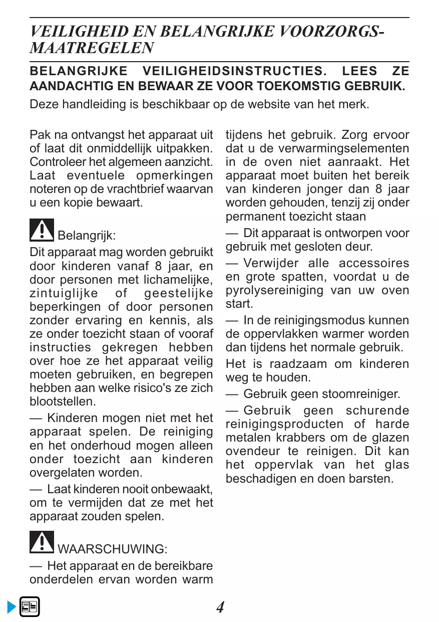 Belangrijk: Dit apparaat mag worden gebruikt door kinderen vanaf 8 jaar, en door personen met lichamelijke, zintuiglijke of geestelijke beperkingen of door personen zonder ervaring en kennis, als ze onder toezicht staan of vooraf instructies gekregen hebben over hoe ze het apparaat veilig moeten gebruiken, en begrepen hebben aan welke risico's ze zich blootstellen. — Kinderen mogen niet met het apparaat spelen. De reiniging en het onderhoud mogen alleen onder toezicht aan kinderen overgelaten worden. — Laat kinderen nooit onbewaakt, om te vermijden dat ze met het apparaat zouden spelen. WAARSCHUWING: — Het apparaat en de bereikbare onderdelen ervan worden warm