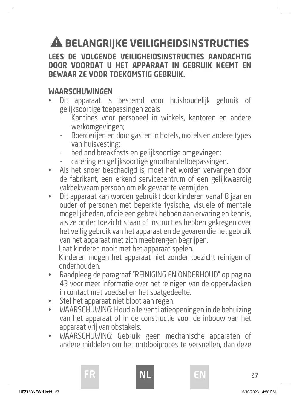 UFZ163NFWH.indd 48 5/10/2023 4:50 PM VERWIJDERING Als verantwoordelijke handelaar dragen we zorg voor het milieu. We moedigen u aan om de juiste verwijderingsprocedure voor uw apparaat en verpakkingsmateriaal te volgen. Dit draagt bij tot het behoud van de natuurlijke rijkdommen door deze te recyclen zodat zowel de menselijke gezondheid en het milieu worden beschermd. Gooi dit apparaat en de verpakking weg in overeenstemming met de geldende wetgeving en voorschriften. Aangezien dit apparaat elektronische componenten bevat moet het apparaat en toebehoren aan het einde van hun levensduur afzonderlijk van het huisafval worden weggegooid. Neem contact op met uw gemeente voor informatie over afdanking en recycling. Lever het apparaat in bij het inzamelpunt van uw gemeente voor recycling. Bij sommige inzamelpunten kunt u het apparaat gratis inleveren. We verontschuldigen ons voor enig ongemak veroorzaakt door kleine inconsistenties in deze gebruikershandleiding, die kunnen ontstaan door productverbetering of –ontwikkeling. Etablissements Darty & fils ©, 9 Rue des Bateaux-Lavoirs, 94200 Ivry-sur-Seine, France 31/08/2023