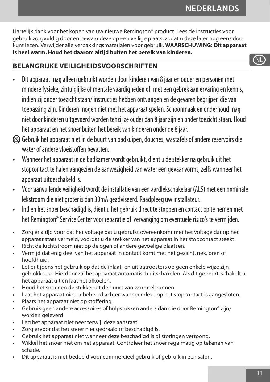 1. Kies een hoge warmte- en snelle snelheidsinstelling. 2. Begin het drogen door de diffusorkom over uw haarwortels te laten zweven en beweeg dan langzaam over de lengte tot ze 100% droog zijn (Afb. D). 3. De zachte luchtstroom versnelt het drogen zonder contact te maken en de natuurlijke vorm van uw krullen te verstoren. • Lorsque l’appareil est utilisé dans une salle de bains, débranchez-le après usage. La proximité de l’eau présente un danger même lorsque l’appareil est éteint. • Pour une protection supplémentaire, l’installation de courant résiduel (RCD)avec un differentiel residuel nominal ne dépassant pas 30mA est recommandée. Demandez de l’aide à un électricien. • Si le cordon d’alimentation de cet appareil est endommagé, cessez immédiatement d’utiliser l’appareil et renvoyez-le au service consommateurs Remington agréé le plus proche en vue de sa réparation ou de sa substitution afin d’éviter tout risque. • • • Evitez tout contact de l’appareil avec le visage, le cou ou le cuir chevelu. En cours d’utilisation, prenez garde à ce que les grilles internes et externes ne soient jamais bloquées, ce qui entraînerait un arrêt automatique de l’appareil. Si cela se produit, éteignez l’appareil et laissez-le refroidir. Veillez à maintenir le cordon d’alimentation et la prise électrique à distance des surfaces chauffées. Ne pas laisser l’appareil sans surveillance lorsqu’il est branché. Ne pas placer l’appareil sur des tissus d’ameublement. Ne pas utiliser d’autres accessoires que ceux fournis. Ne déposez pas l’appareil sur une surface quand il est encore en fonctionnement. N’utilisez pas l’appareil si le cordon est endommagé. Veillez à ne pas enrouler le cordon autour de l’appareil. Inspectez régulièrement le cordon pour détecter tout dommage apparent. Cet appareil n’est pas destiné à une utilisation commerciale ou en salon.