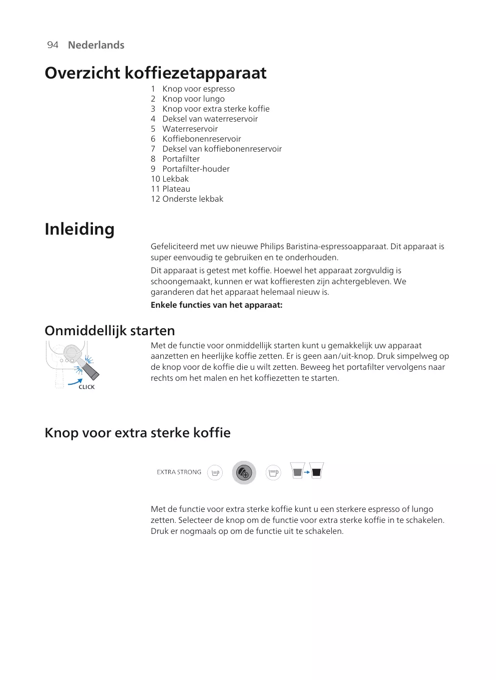 Inleiding Gefeliciteerd met uw nieuwe Philips Baristina-espressoapparaat. Dit apparaat is super eenvoudig te gebruiken en te onderhouden. Dit apparaat is getest met koffie. Hoewel het apparaat zorgvuldig is schoongemaakt, kunnen er wat koffieresten zijn achtergebleven. We garanderen dat het apparaat helemaal nieuw is. Enkele functies van het apparaat: