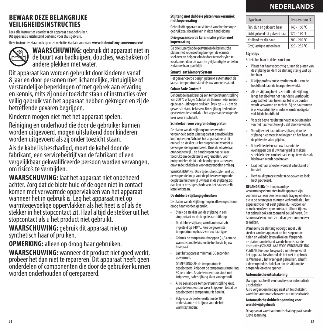 OPMERKING: Als de temperatuur is geseleedeer, knippert de temperaturinstelling 30 Seconden, als de temperatuur stopt met knipperen, is de stijtang kaar voor gebruik.