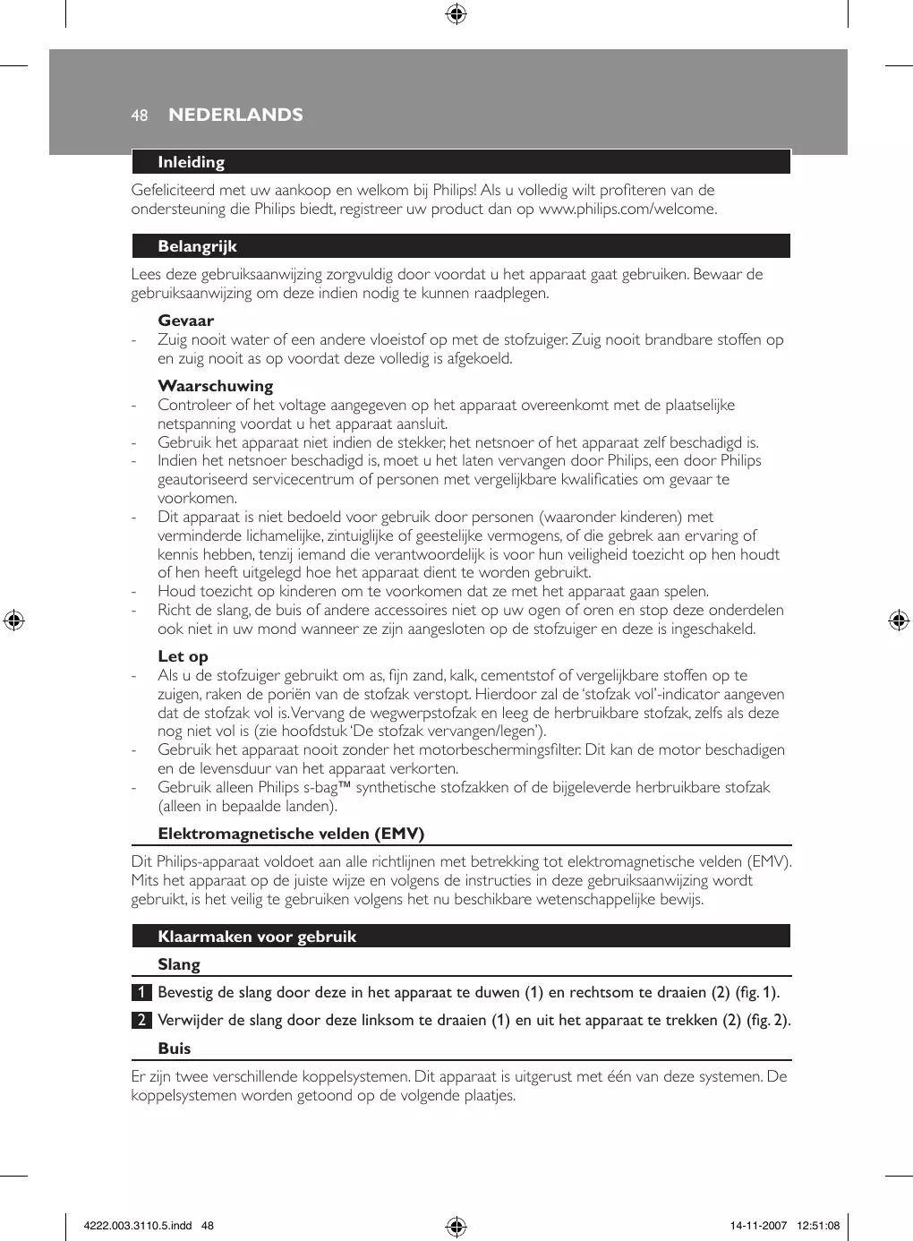 Gevaar Zuig nooit water of een andere vloeistof op met de stofzuiger. Zuig nooit brandbare stoffen op en zuig nooit as op voordat deze volledig is afgekoeld. Waarschuwing Controleer of het voltage aangegeven op het apparaat overeenkomt met de plaatselijke netspanning voordat u het apparaat aansluit. Gebruik het apparaat niet indien de stekker, het netsnoer of het apparaat zelf beschadigd is. Indien het netsnoer beschadigd is, moet u het laten vervangen door Philips, een door Philips geautoriseerd servicecentrum of personen met vergelijkbare kwalificaties om gevaar te voorkomen. Dit apparaat is niet bedoeld voor gebruik door personen (waaronder kinderen) met verminderde lichamelijke, zintuiglijke of geestelijke vermogens, of die gebrek aan ervaring of kennis hebben, tenzij iemand die verantwoordelijk is voor hun veiligheid toezicht op hen houdt of hen heeft uitgelegd hoe het apparaat dient te worden gebruikt. Houd toezicht op kinderen om te voorkomen dat ze met het apparaat gaan spelen. Richt de slang, de buis of andere accessoires niet op uw ogen of oren en stop deze onderdelen ook niet in uw mond wanneer ze zijn aangesloten op de stofzuiger en deze is ingeschakeld. Let op Als u de stofzuiger gebruikt om as, fijn zand, kalk, cementstof of vergelijkbare stoffen op te zuigen, raken de poriën van de stofzak verstopt. Hierdoor zal de ‘stofzak vol’-indicator aangeven dat de stofzak vol is. Vervang de wegwerpstofzak en leeg de herbruikbare stofzak, zelfs als deze nog niet vol is (zie hoofdstuk ‘De stofzak vervangen/legen’). Gebruik het apparaat nooit zonder het motorbeschermingsfilter. Dit kan de motor beschadigen en de levensduur van het apparaat verkorten. Gebruik alleen Philips s-bag` synthetische stofzakken of de bijgeleverde herbruikbare stofzak (alleen in bepaalde landen). Elektromagnetische velden (EMV)