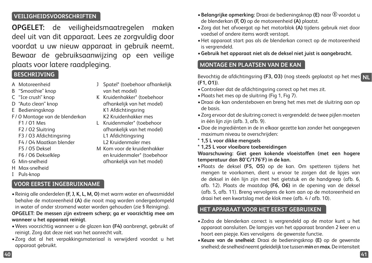 F/ O C onjunto de la jarra de la batidora F1 / O1 Conjunto de las cuchillas F2 / O2 Aro de bloqueo F3 / O3 Junta F4 / O4 Jarra graduada de la batidora F5 / O5 Tapa F6 / O6 Tapón de la tapa G Velocidad mínima H Velocidad máxima I Botón de pulsación