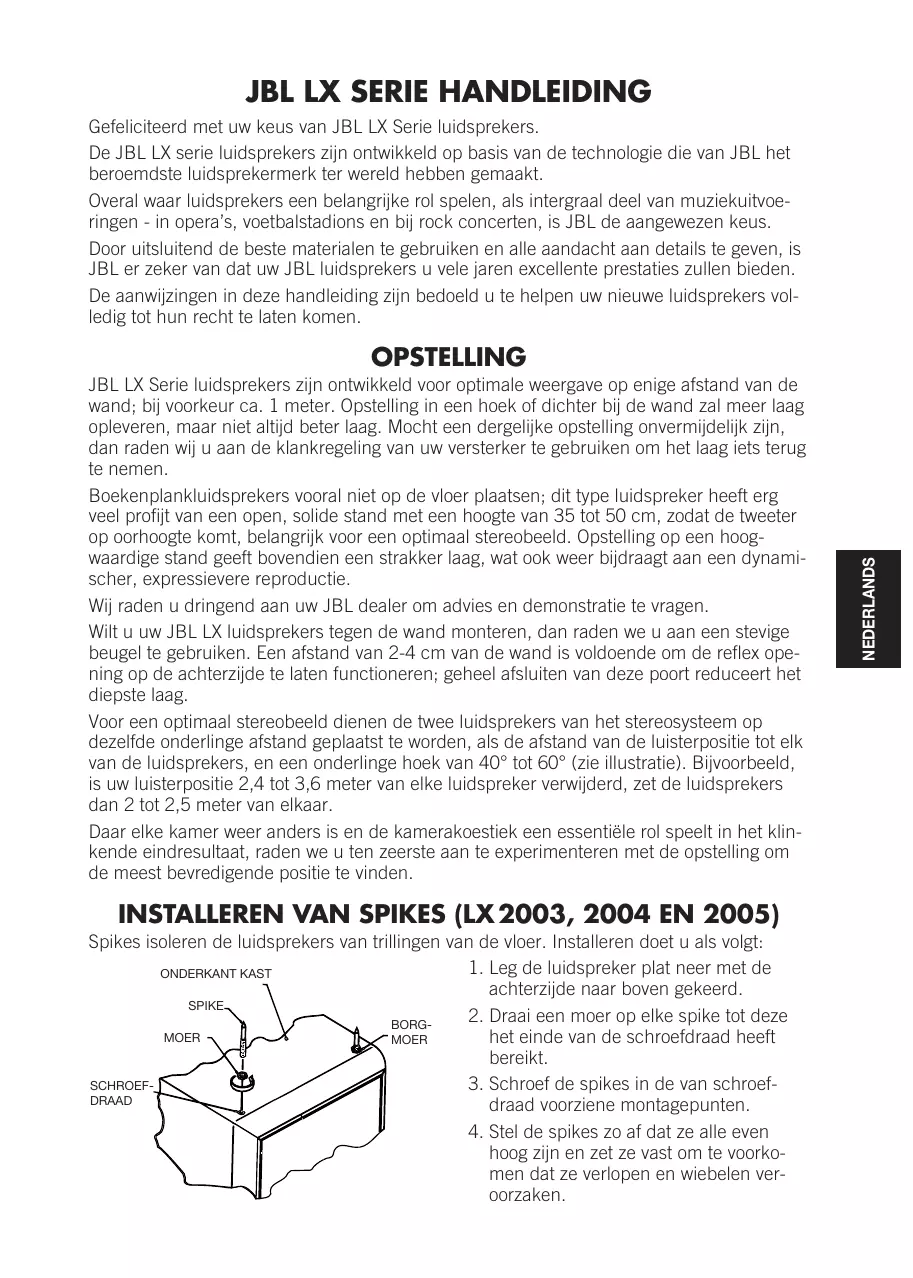 Los altavoces de la serie LX de JBL han sido diseñados utilizando la tecnología que ha hecho de JBL la marca de altavoces más famosa del mundo. Allá donde los altavoces sean una parte integral importante de las representaciones musicales, como son teatros de ópera, estadios de fútbol o conciertos de rock, JBL es la marca de altavoces preferida. Gracias a que únicamente se utilizan los mejores materiales disponibles y a que se presta el mayor cuidado en todos los detalles, JBL tiene la certeza de que sus altavoces le ofrecerán largos años de excelente rendimiento. Las instrucciones de este manual le ayudarán a extraer todo el potencial de que disponen sus altavoces.