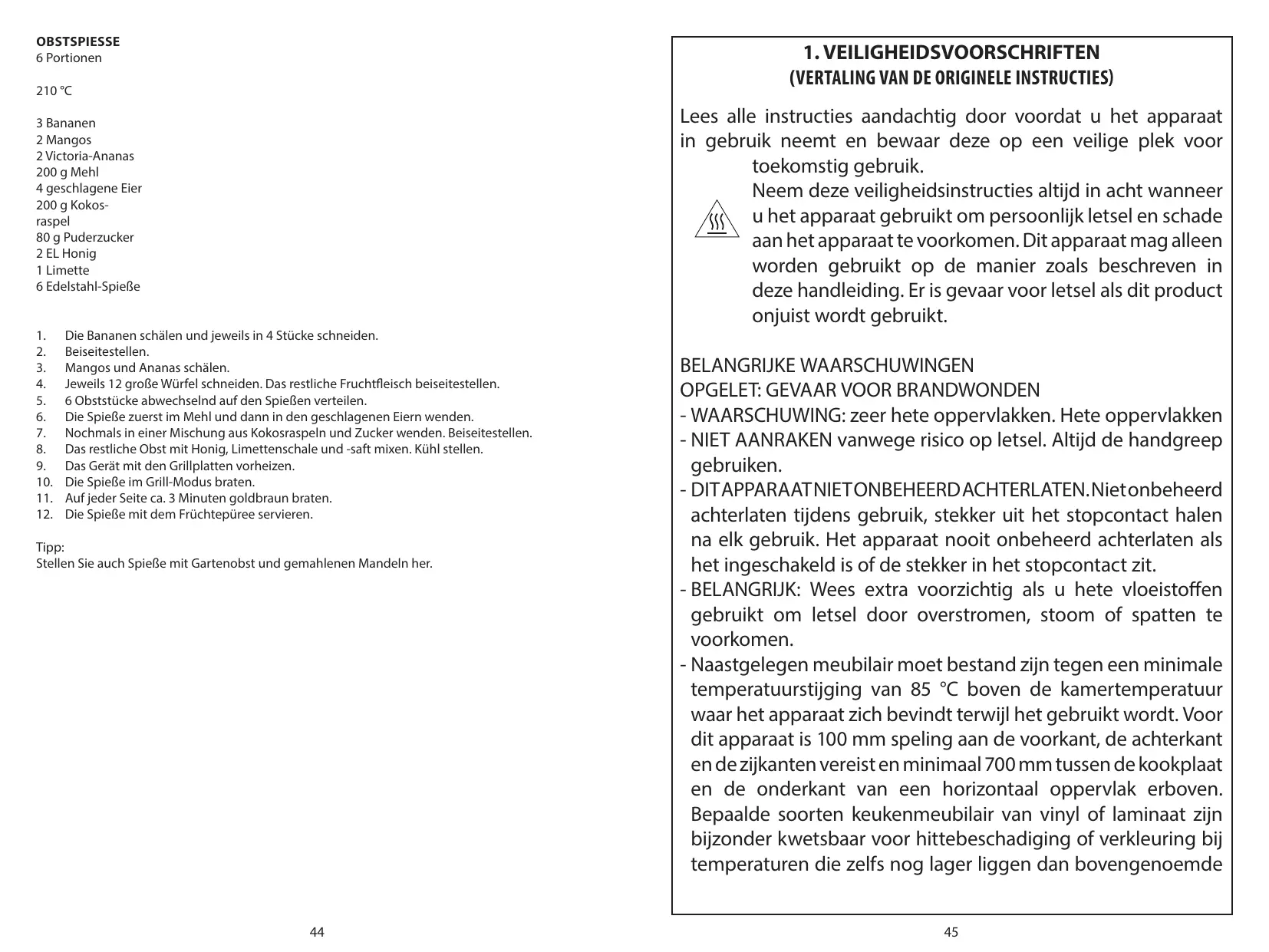 Rol de spiesen vervolgens door een kokos-suikermengsel. Zet apart. Mix de rest van het fruit met de honing en met de schil en het sap van de limoen. Zet in de koelkast. 9. Verwarm het apparaat voor met de grillplaten erop bevestigd. 10. Bak de spiesen rondom op de barbecuestand. 11. Bak elke kant ongeveer 3 minuten. 12. Serveer de spiesen met de frisse fruitsaus. Suggestie: Maak ook eens fruitspiesen met boomgaardfruit en amandelmeel. - No permita que el cable de alimentación entre en contacto con ninguna fuente de calor. - Ya que las superficies exteriores pueden calentarse durante el uso del electrodoméstico, asegúrese de no permitir que dichas