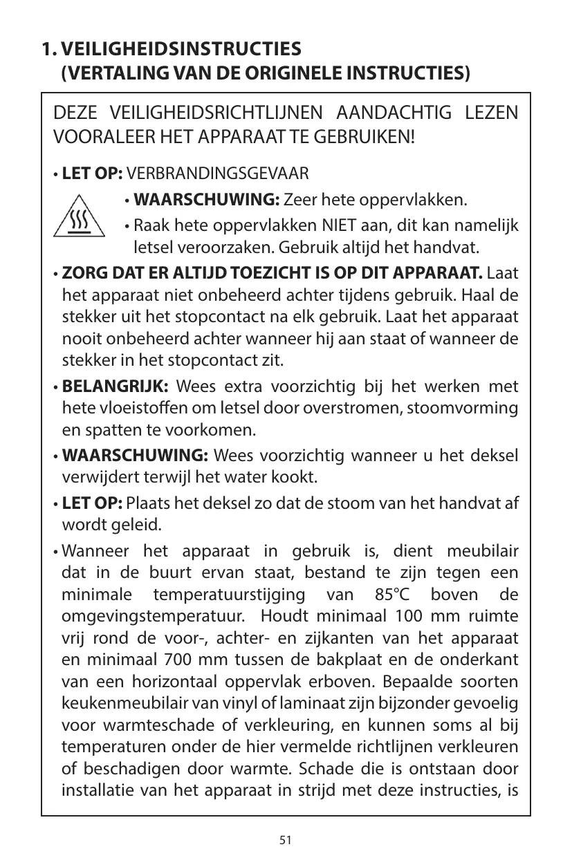 • AVERTISSEMENT : ôter le couvercle avec précaution lorsque l’eau est en ébullition. • ATTENTION : positionner le couvercle de façon à dévier la vapeur de la poignée. • Toute pièce de mobilier adjacente doit pouvoir résister à une augmentation de température d’au moins 85 °C au-dessus de la température ambiante de la pièce où se trouve l’appareil durant son utilisation. L’espace autour de l’appareil doit être dégagé de 100 mm à l’avant, à l’arrière et sur les côtés de l’appareil et de 700 mm entre la plaque de cuisson et le côté inférieur de toute surface horizontale située au-dessus de l’appareil. Certains meubles de cuisine en vinyle ou en stratifié sont particulièrement sensibles aux dommages dus à la chaleur ou aux décolorations dues à des températures élevées, même inférieures aux directives susmentionnées. Tout dommage découlant d’une installation de l’appareil 1