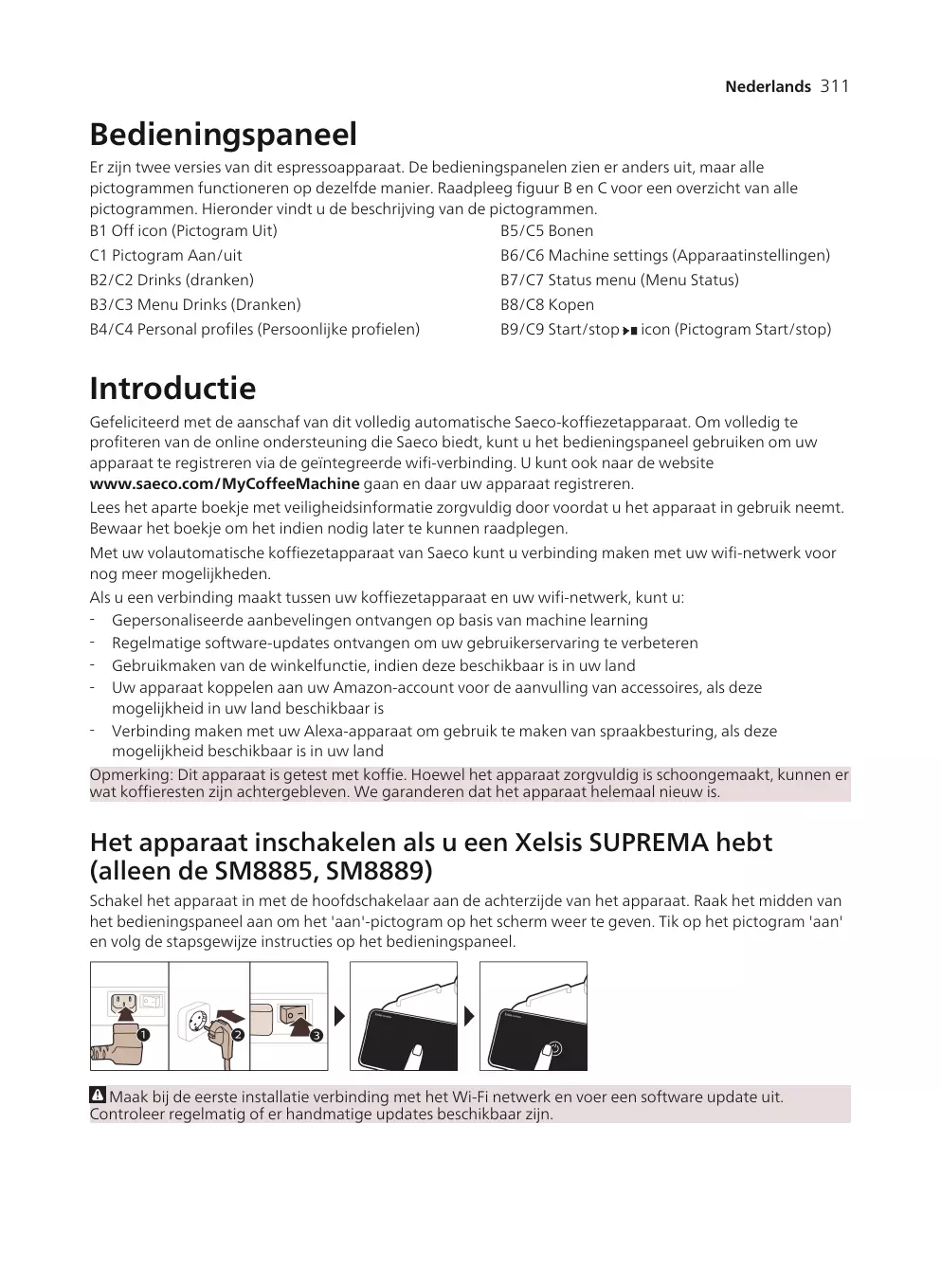 B6/C6 Machine settings (Paramètres de la machine) C1 On/off icon (Icône marche/arrêt) B2/C2 Drinks (Boissons) Votre machine à café Saeco entièrement automatique vous permet de vous connecter à votre réseau Wi-Fi pour une expérience optimale. En connectant votre machine à votre réseau Wi-Fi, vous pourrez : - recevoir des recommandations personnalisées basées sur l’apprentissage machine ; - bénéficier de mises à jour logicielles régulières pour améliorer votre expérience utilisateur ; - accéder à la boutique (sous réserve de disponibilité dans votre pays) ; - associer votre machine à votre compte Amazon (sous réserve de disponibilité dans votre pays) pour vos réapprovisionnements en accessoires ; - vous connecter à votre appareil Alexa et commander vocalement votre machine (sous réserve de disponibilité dans votre pays). Remarque : Cette machine a été testée avec du café. Bien qu'elle ait été soigneusement nettoyée, il se peut que quelques résidus de café subsistent. Nous garantissons néanmoins que la machine est entièrement neuve.