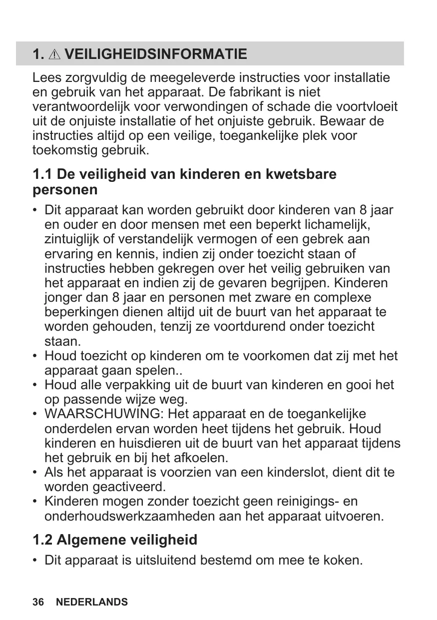1. INFORMATION SUR LA SÉCURITÉ 103 2. CONSIGNES DE SÉCURITÉ105 3. DESCRIPTION DE L'APPAREIL108 4. BANDEAU DE COMMANDE109 5. AVANT LA PREMIÈRE UTILISATION 110 6. UTILISATION QUOTIDIENNE 112 7. FONCTIONS DE L'HORLOGE117 8. UTILISATION DES ACCESSOIRES118 9. FONCTIONS SUPPLÉMENTAIRES 120 10. CONSEILS 122 11. ENTRETIEN ET NETTOYAGE 125 1.1 Sécurité des enfants et des personnes vulnérables • Cet appareil peut être utilisé par des enfants âgés d'au moins 8 ans et par des personnes ayant des capacités physiques, sensorielles ou mentales réduites ou dénuées d’expérience ou de connaissance, s'ils sont correctement surveillés ou si des instructions relatives à l'utilisation de l'appareil en toute sécurité leur ont été données et s’ils comprennent les risques encourus. Les enfants de moins de 8 ans et les personnes ayant un handicap très important et complexe doivent être tenus à l'écart de l’appareil, à moins d'être surveillés en permanence. • Veillez à ce que les enfants ne jouent pas avec l’appareil. • Ne laissez pas les emballages à la portée des enfants et jetez-les convenablement. • AVERTISSEMENT : L'appareil et ses parties accessibles deviennent chauds pendant l'utilisation. Tenez les enfants et les animaux éloignés de l’appareil lorsqu’il est en cours d’utilisation et de refroidissement. • Si l'appareil est équipé d'un dispositif de sécurité enfants, nous vous recommandons de l'activer. • Le nettoyage et l'entretien par l'usager ne doivent pas être effectués par des enfants sans surveillance.